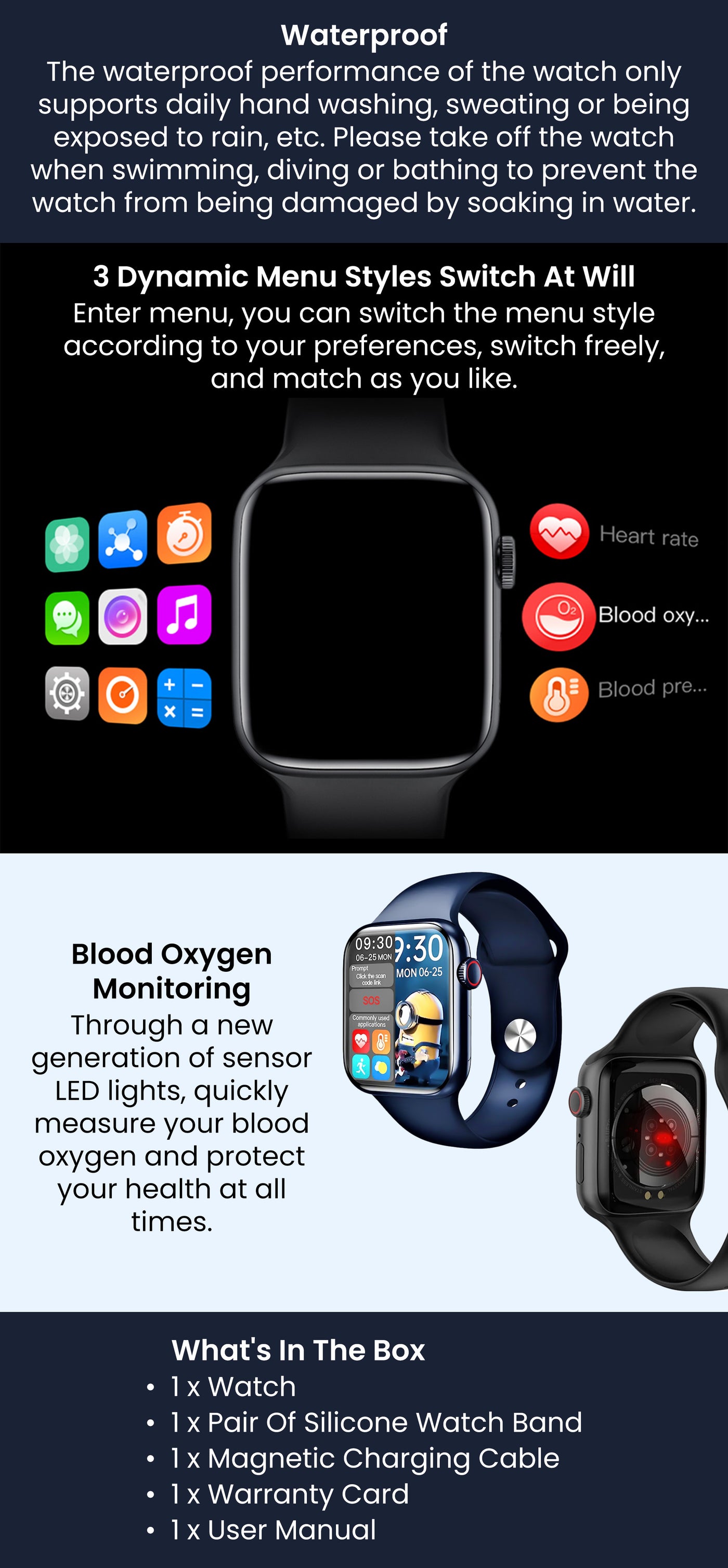 | محتويات العلبة | 1x Watch, 1x Pair Of Silicon Watch Band, 1x Magnetic Charging Cable, 1x Warranty Card, 1x User Manual |