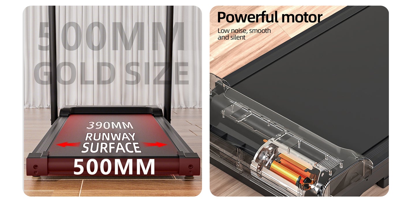Powered by a powerful motor, it delivers smooth, consistent performance across various intensities, while the low-noise operation ensures it won’t disturb your home environment. The golden ratio running deck offers ample space for natural strides, complemented by convenient incline adjustment to simulate outdoor terrains and boost workout intensity.