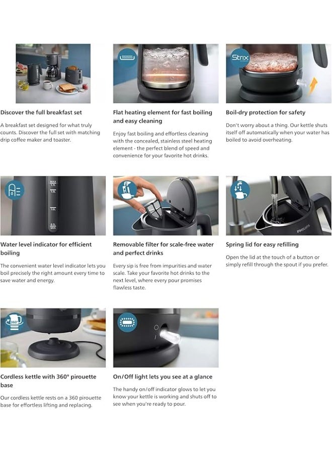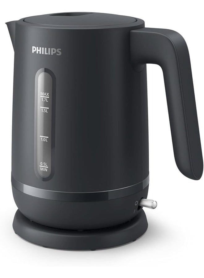 غلاية كهربائية من سلسلة 1000 مخفية، عنصر تسخين من الفولاذ المقاوم للصدأ. حماية من الغليان الجاف للسلامة، فلتر قابل للإزالة لمياه خالية من الترسبات ومشروبات مثالية، غلاية بدون سلك بقاعدة دوارة 360°، غطاء نابض لسهولة إعادة التعبئة 1.7 ل 2200 واط HD9314/91 رمادي فحمي