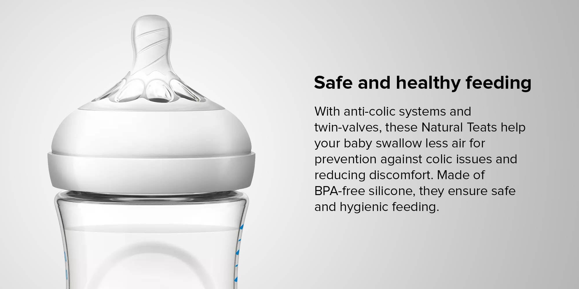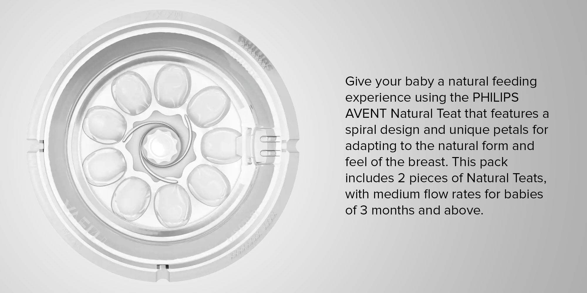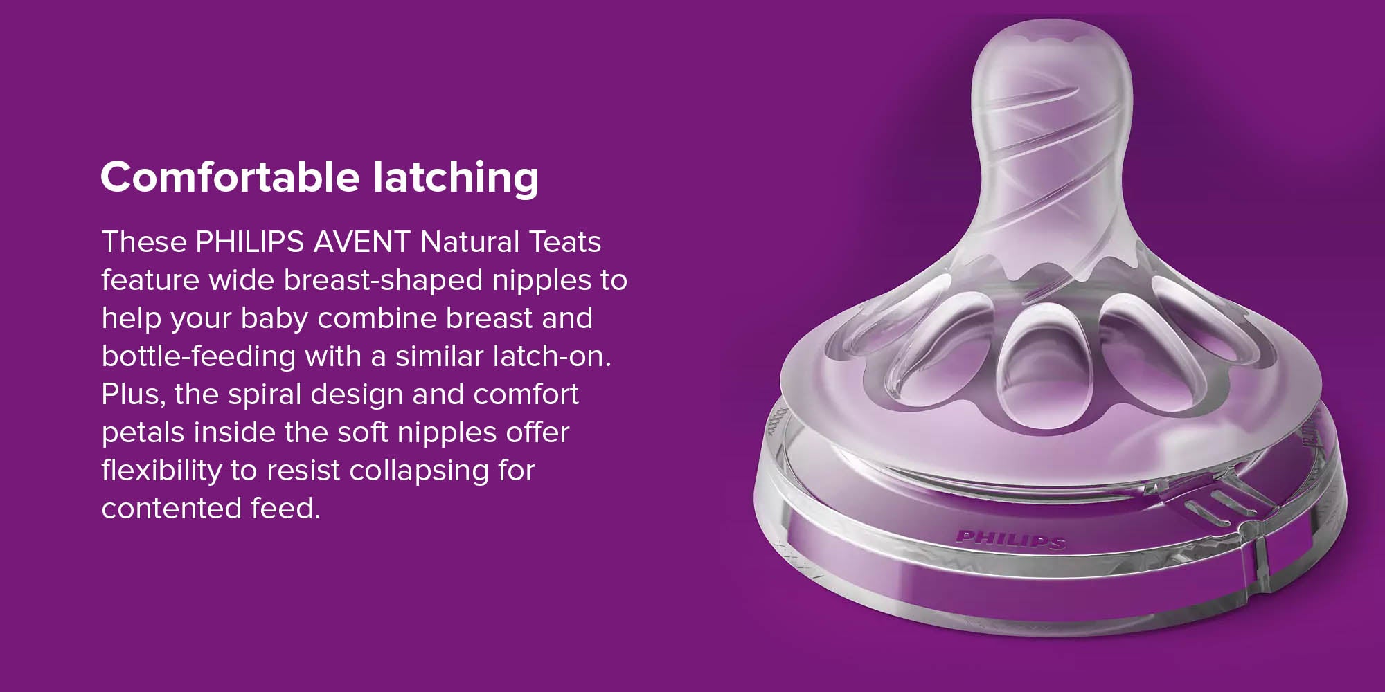 بتلات مريحة وحلمات بشكل طبيعي تمكن من محاكاة الرضاعة الطبيعية. توفر محاكاة للرضاعة الطبيعية بفضل الحلمة على شكل صدر الأم