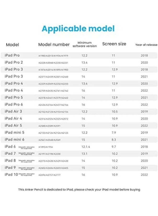 Anker Pencil is compatible with the iPad Pro 12.9-inch (third generation or later), iPad Pro 11-inch (first generation or later)
