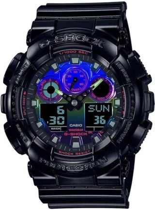 GA-100RGB-1ADR: G-Shock analog-digital watch with RGB color accents, 200M water resistance, vibrant and modern.