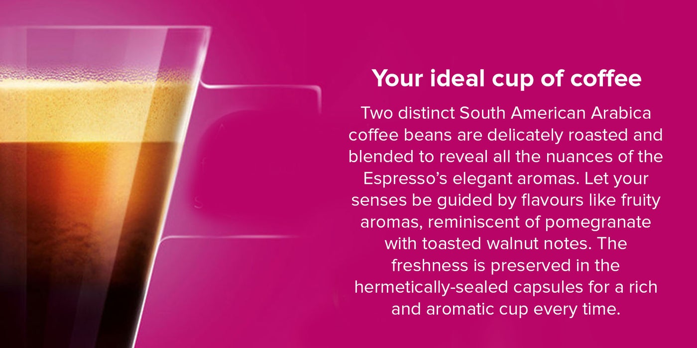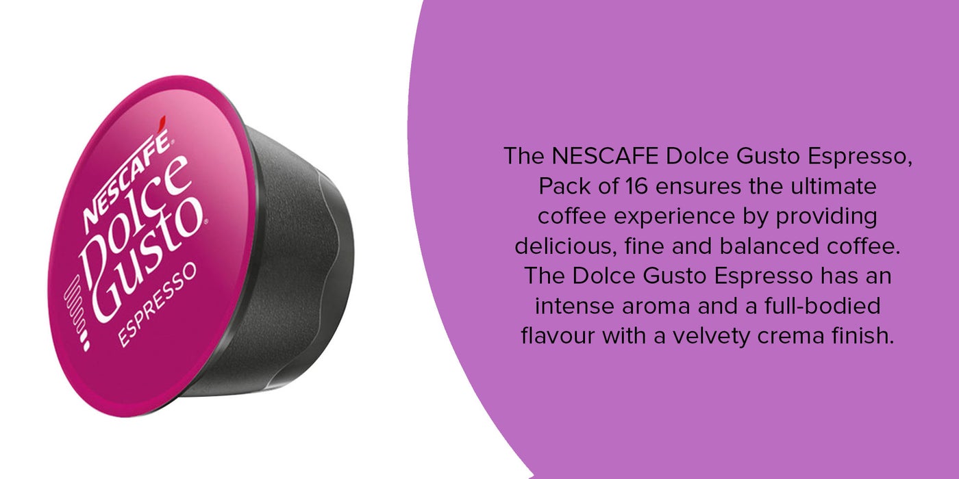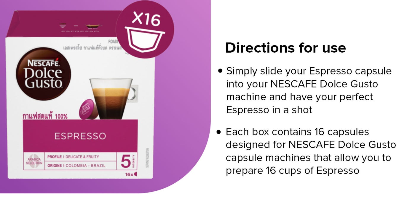 | معلومات الإعداد | Create professional quality coffees with a thick velvety crema, thanks to the machine’s high pressure (up to 15 bars). Simply slide your Espresso capsule into your NESCAFÉ Dolce Gusto machine. Your coffee will be ready right away |