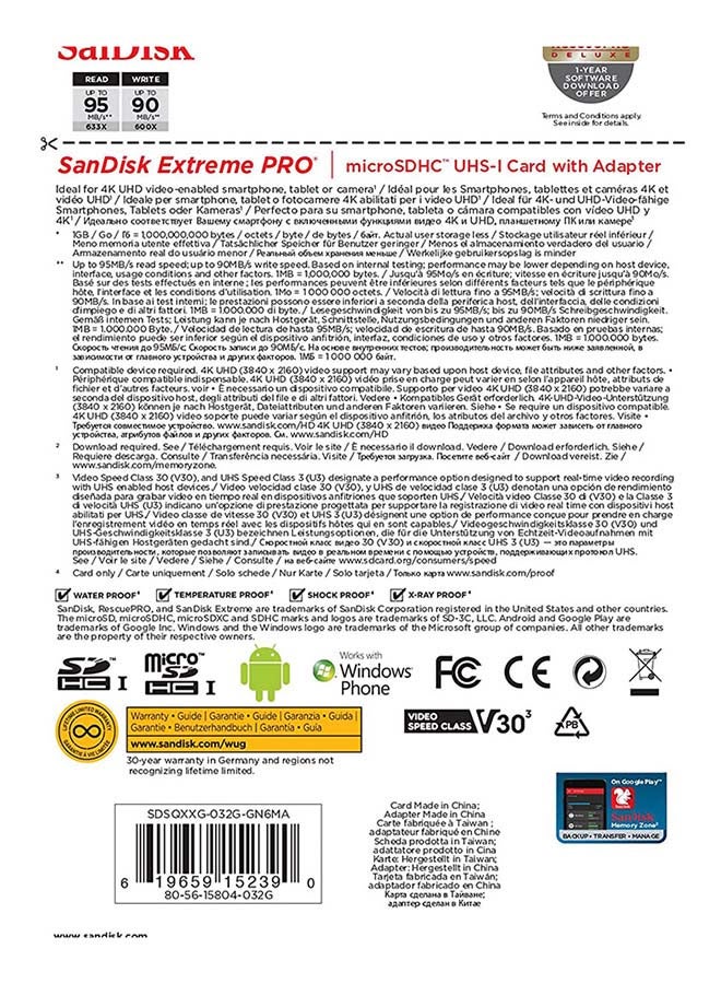 بطاقة ذاكرة إكستريم برو من نوع ميكرو SDHC + محول SD + بطاقة ريسكيو برو فاخرة بسرعة نقل بيانات 100 ميجابايت/ ثانية، تدعم صيغ A1 وC10 وV30 وبطاقة UHS-I تدعم صيغة U3