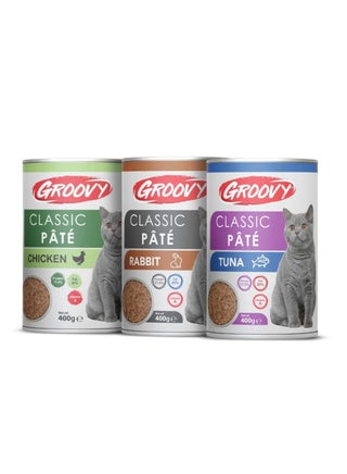 مجموعة متنوعة من جروفي مأكولات القطط الرائعة - باتيه كلاسيكي بثلاث نكهات: أرنب، دجاج، وتونة