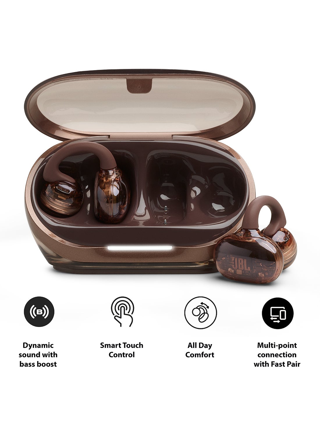 سماعات JBL Soundgear Clips اللاسلكية المفتوحة، تصميم SonicArc، تصل إلى 32 ساعة من وقت التشغيل الكلي، 4 ميكروفونات بتقنية تشكيل الشعاع، مقاومة للماء والغبار IP54، تقنية JBL OpenSound، لون نحاسي شفاف