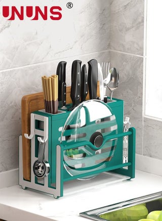 Multi-function:5-in-1 multi-function wall-mounted tableware rack, which can store knives, tableware, cutting board, pot lid, etc. Includes four small hooks for storing small kitchen utensils.