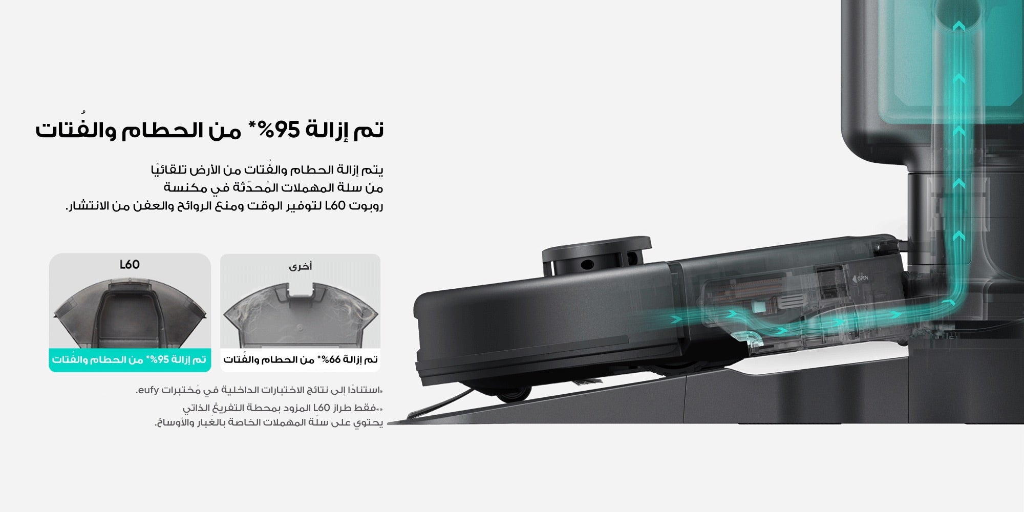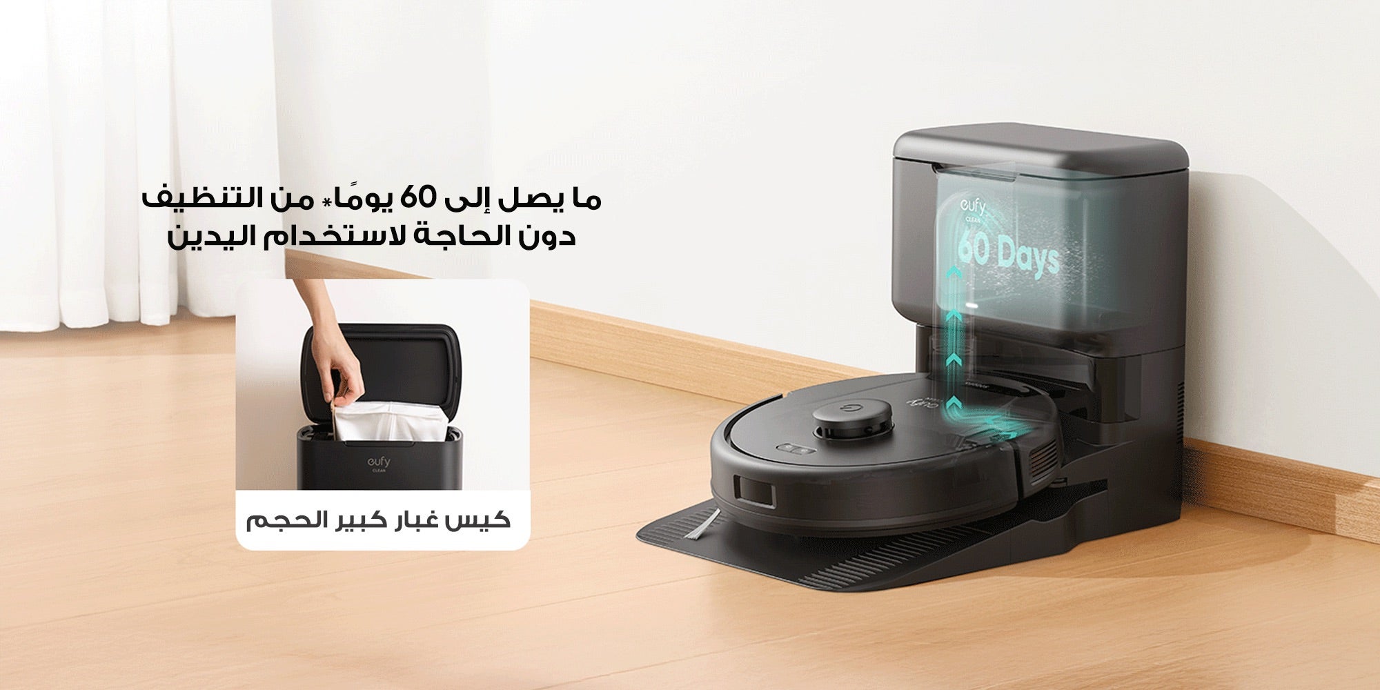 سعة كبيرة ما يصل إلى 60 يومًا* من التنظيف دون الحاجة لاستخدام اليدين: يعمل الشفط بقوة 17,000 باسكال على سحب الغبار وبقايا الطعام من صندوق الغبار الخاص بـ L60، ونقله إلى كيس الغبار مباشرةً بسعة 2.5 ليتر في علبة التفريغ الذاتي. وبفضل ميزة السعة الكبيرة، ستتمكن من إبقاء كيس المكنسة لمدة تصل إلى 60 يومًا قبل الاستبدال.