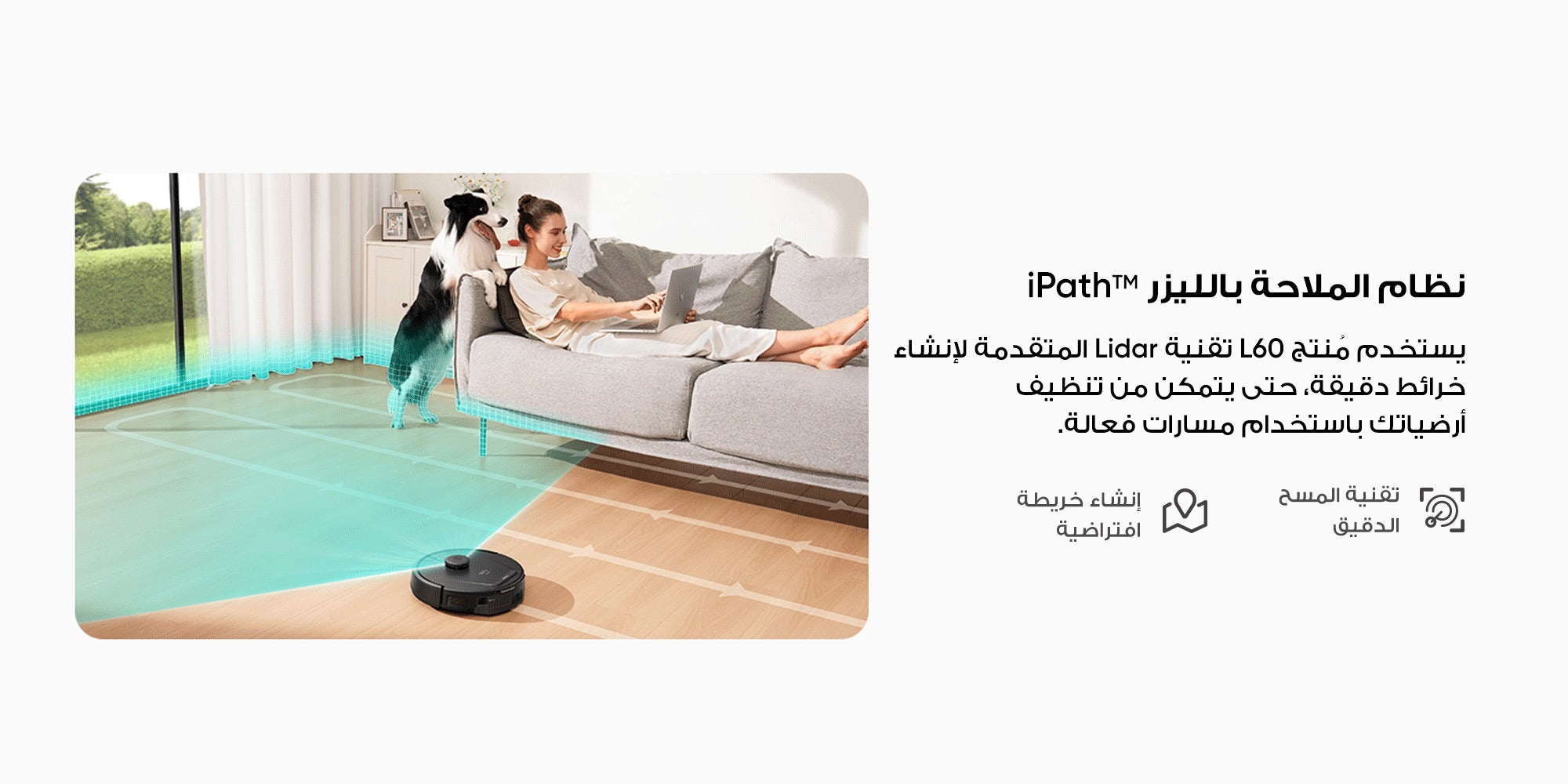 ميزة رسم خرائط دقيقة للمنزل للتنقّل والحركة الفعالة: يستخدم نظام iPath Laser Navigation تقنية Lidar المتطورة لمسح الغرف جغرافيًا، وإنشاء خرائط دقيقة لكل المنزل، ما يحقق لك مسارات تنظيف فعالة لكامل منزلك.