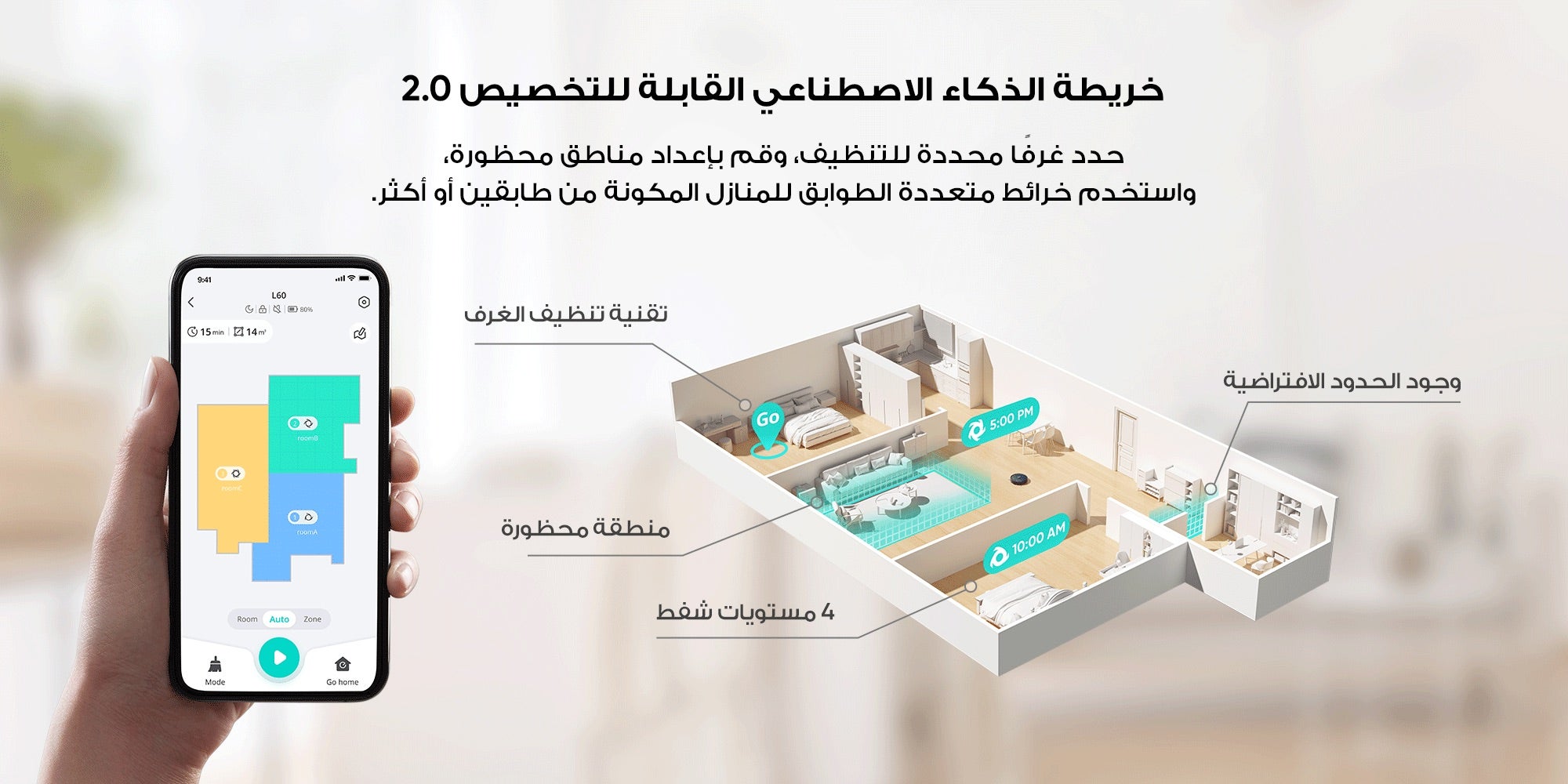 تقنية AI.Map 2.0 قابلة للتخصيص بسهولة: يمكنك استخدام التطبيق الذكي لتحديد غرف معينة للتنظيف فقط، وتحديد المناطق التي لا تحتاج تنظيف، مع استخدام الخرائط للمنازل متعددة الطوابق، والتي تضم أكثر من طابق واحد.