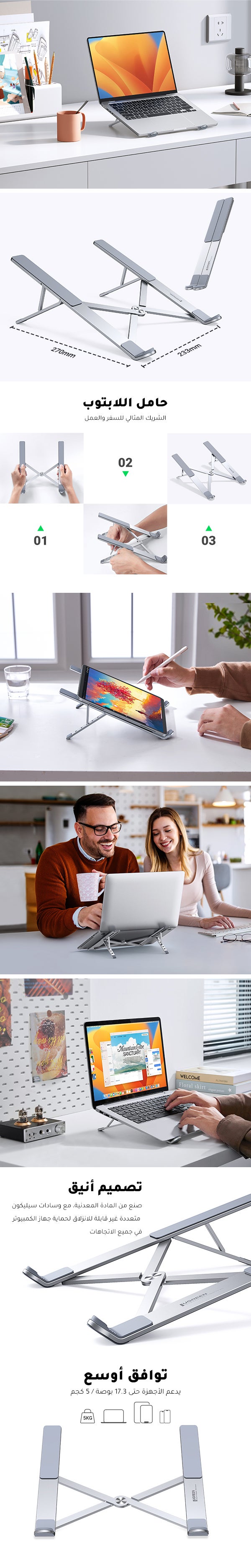 【صغير وقابل للطي】حامل مكتب لرفع اللابتوب رفيع وخفيف الوزن وسهل الحمل من يو جرين. يتميز بكونه صغيراً وقابلاً للتعديل والطي مع حقيبة حافظة لتسهيل حمله. يعد اختياراً مثالياً لجولة العمل أو الرحلة. كما يتميز بتصميم بسيط وعصري ما يجعله مثالياً للتعبير عن نمط حياتك.