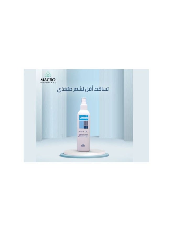 سبراي مقوي للشعر . تركيبة غنية بالزيوت اللازمة لتطيل من عمر الشعر. . الحل المثالي الإعادة الحيوية والقوة للشعر. . يساعد على منع تساقط الشعر. طريقة الإستخدام : . توضع كمية مناسبة من ليندو سبراي على الشعر وجدوره مع التدليك جيداً لفروة الرأس. . لأحسن نتائج يمكن عمل حمام زيت من ليندو سبراي عن طريق وضع ليند و سبراي على الشعر تم لغه بمنشفة مشبعة بالبخار الساخن لمدة ساعة. للإستعمال الخارجي فقط. تجنب ملامسة العين. إنتاج ماكرو جروب للمستحضرات الطبية - ماكرو كابيتال صنع في مصر