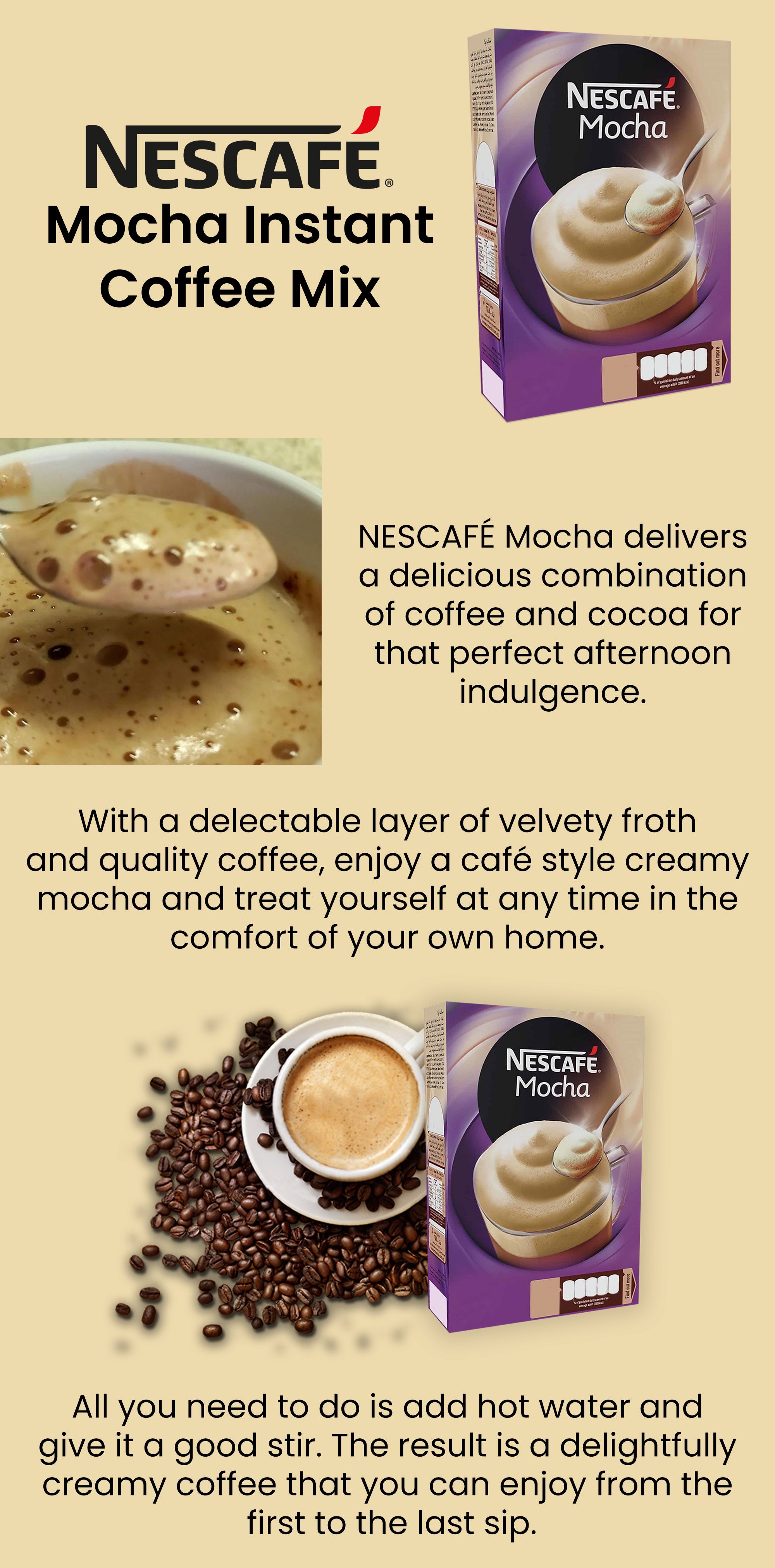 وصف العلامة التجارية : في عام 1929، تم تحدي نستله للمساعدة في الحفاظ على فائض حبوبِ البن في البرازيل التي نتجت عن انهيار وول ستريت . وقبلت نستله التّحدي. كان أخصائي القهوة الخاص بنا ماكس مورغنثالر في مهمة لإنشاء فنجان قهوة لذيذ ببساطة عن طريق إضافة الماء. عمل ماكس وفريقه بجد لإيجاد طريقة جديدة لصنع قهوة فورية تحافظ على النكهة الطبيعية للقهوة. فِي عام 1938، وجدوا الجواب، ولدت نسكافيه. سميت باستخدام الحروف الثلاثة الأولى في نستله وخنقه مع ne escafea يورو، أصبح نسكافيه الاسم الجديد في القهوة.