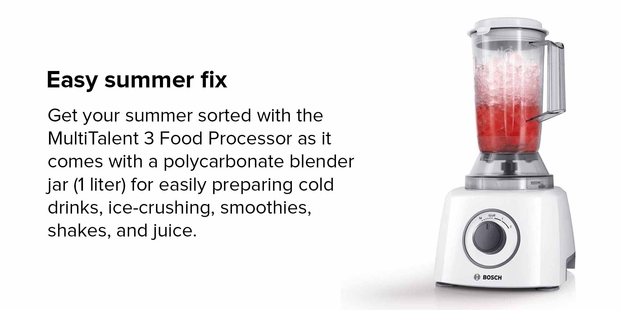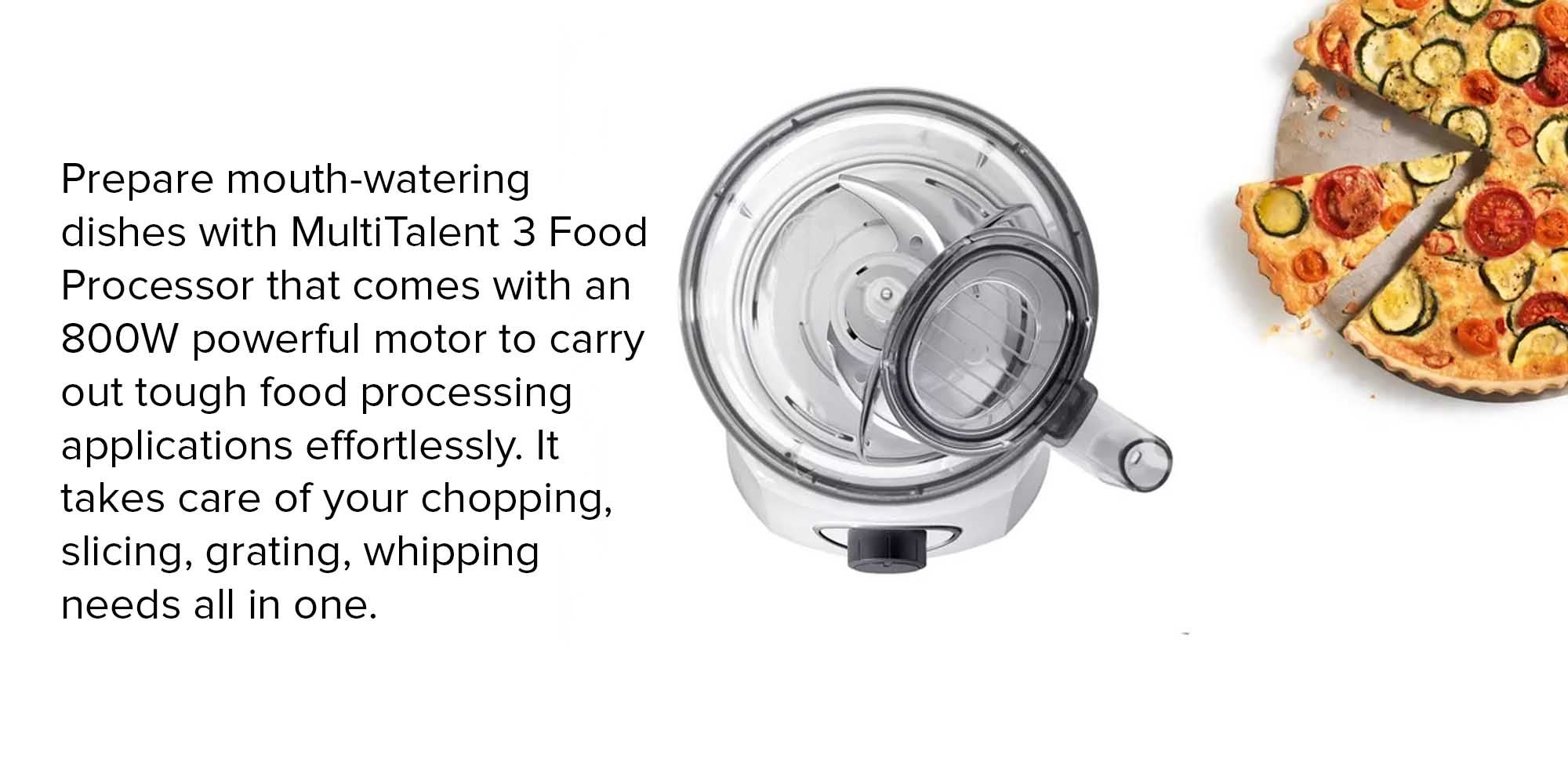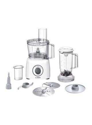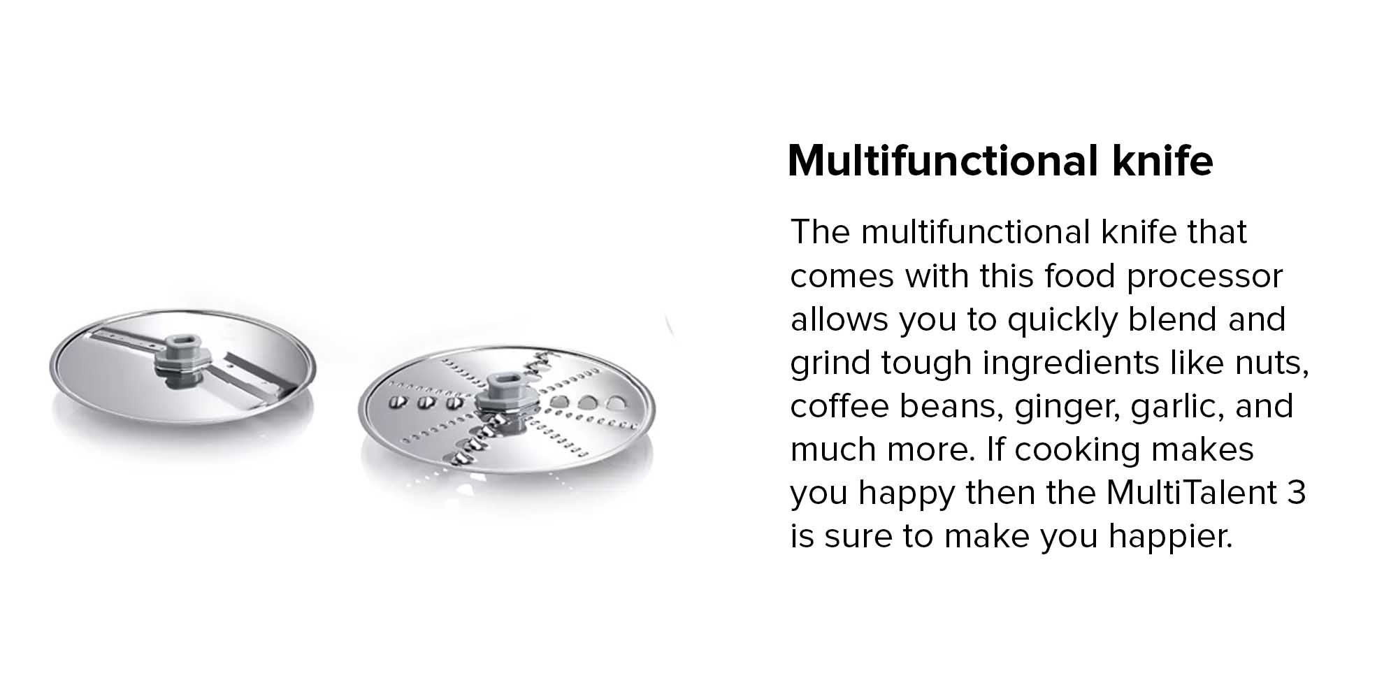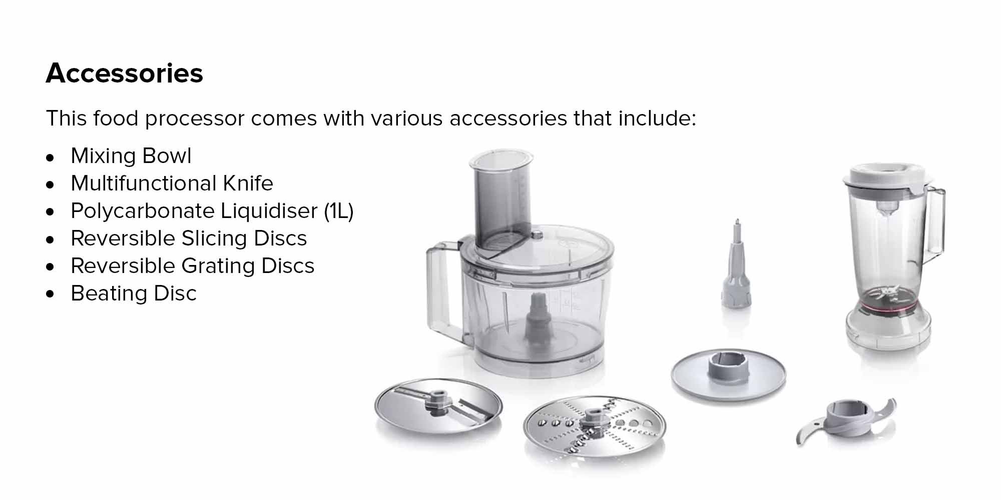 | محتويات العلبة | Mixing Bowl, Multifunctional Knife, Polycarbonate Liquidiser (1L), Reversible Slicing Discs, Reversible Grating Discs, Beating Disc |