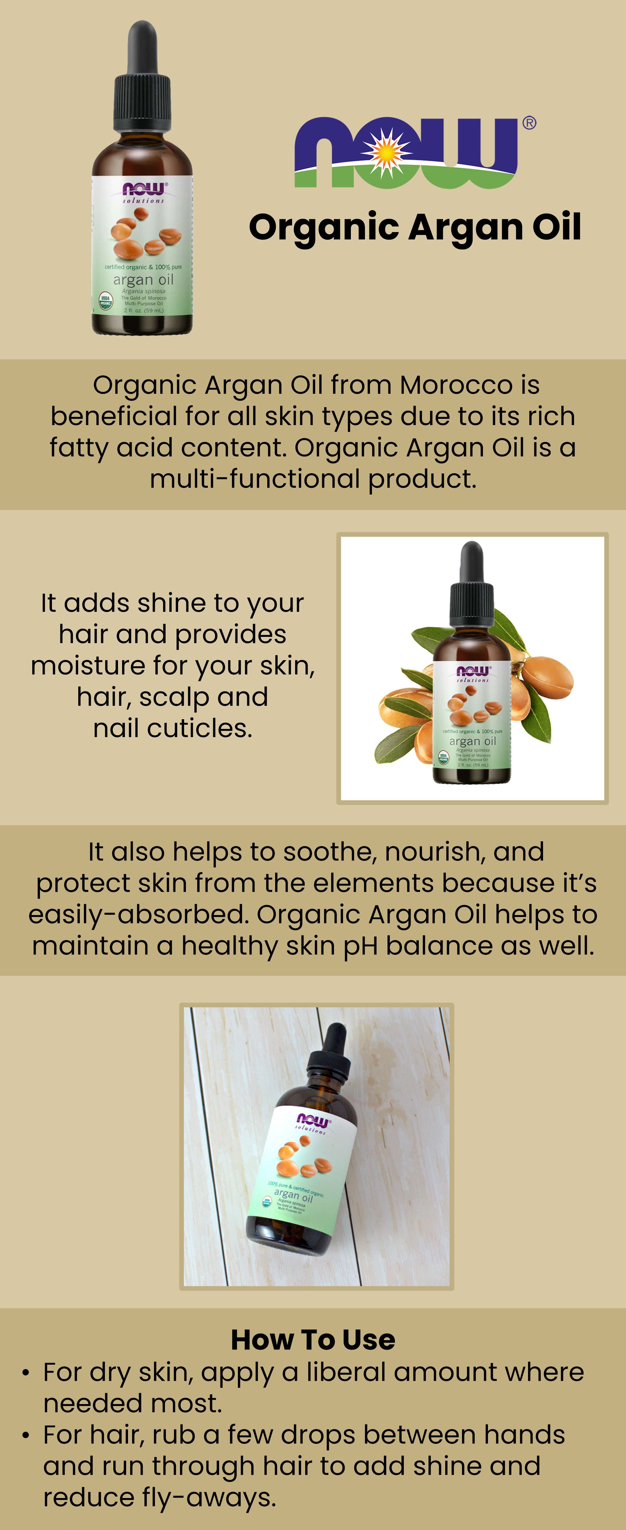 المكونات: زيت الأرغان العضوي (أرجان) (مغربي) (100% نقي) (شجرة المكسرات) وهو غني بالمغذيات الأساسية ومضادات الأكسدة والمركبات المضادة للالتهابات. تشير الأبحاث المبكرة إلى أن زيت الأرجان قد يساعد على منع الأمراض المزمنة، بما في ذلك أمراض القلب والسكري والسرطان. كما يمكن أن يعالج مجموعة متنوعة من الأمراض الجلدية. لقد انتقل زيت الأرجان من مجرد مكون قبلي طبيعي إلى واحد من أكثر الزيوت الثمينة في العالم حيث أن شركات مستحضرات التجميل قد أدركت خصائصه المضادة للشيخوخة. يتم إنتاج زيت النبات من حبات موجودة داخل بذرة الأرغان، والتي توجد داخل ثمار شجرة الأرجان، والتي أصلها المغرب.