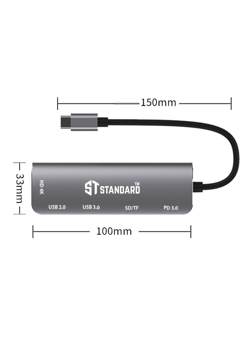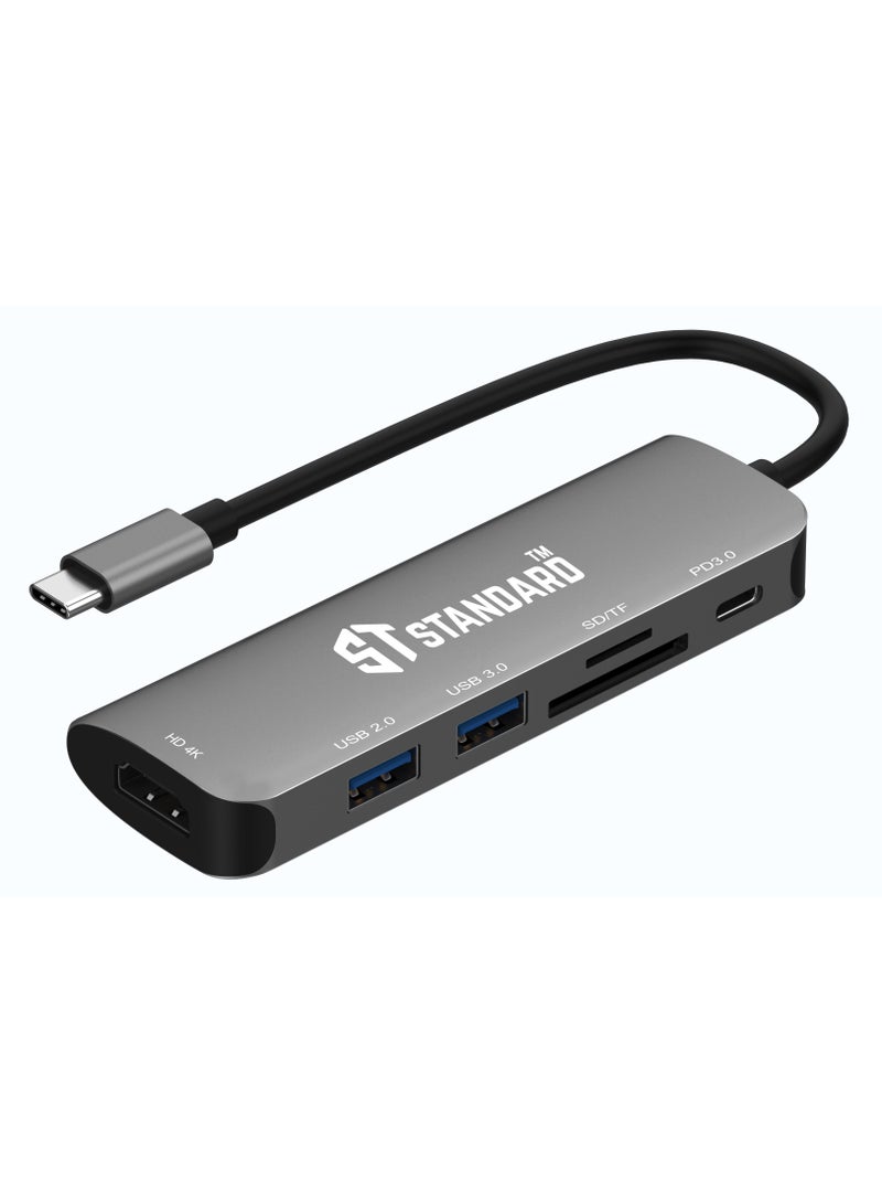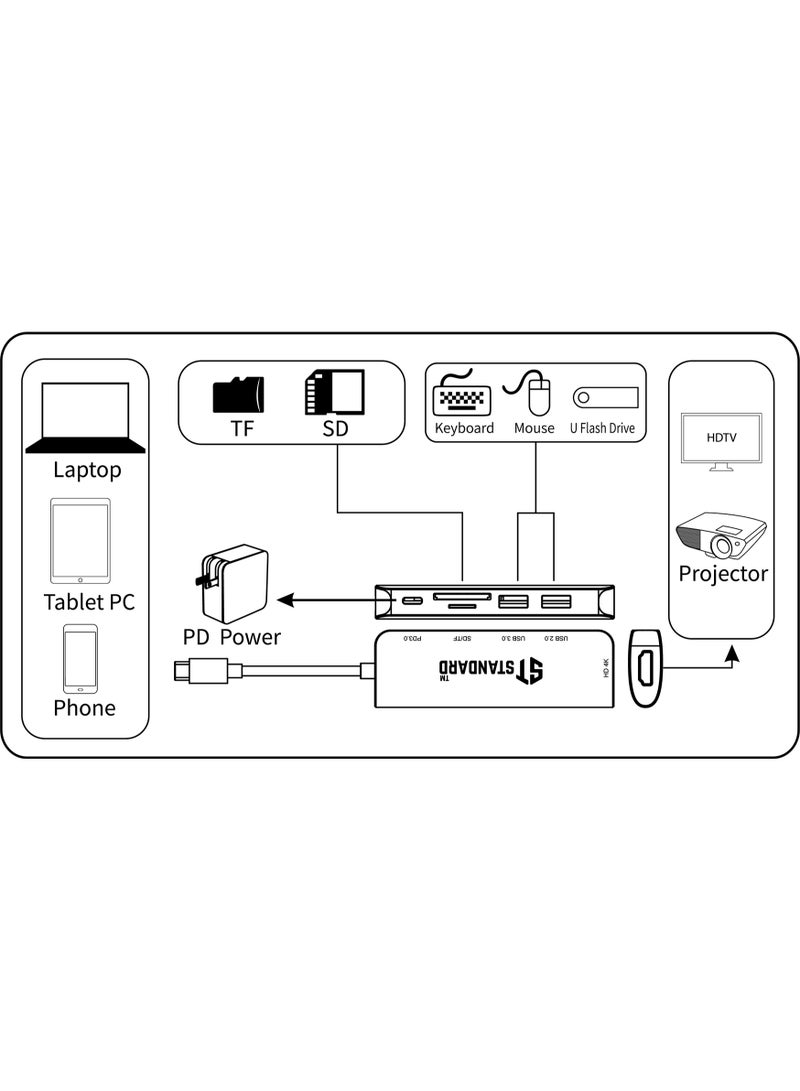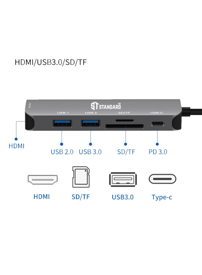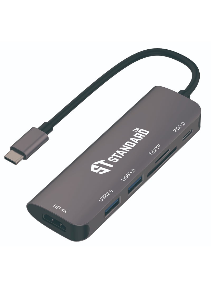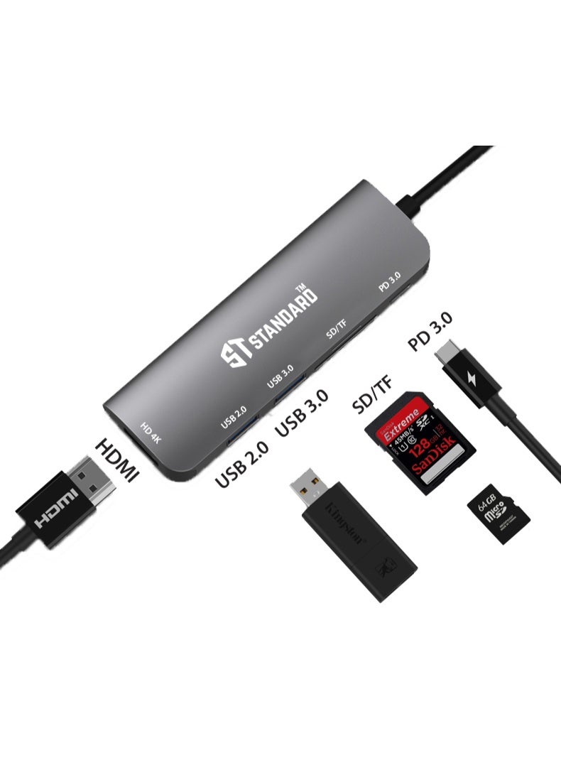 ✔ 6 وظائف في جهاز واحد – HDMI 4K، 2 مخارج USB 3.0، قارئ كروت SD/TF، ومنفذ شحن USB-C PD.