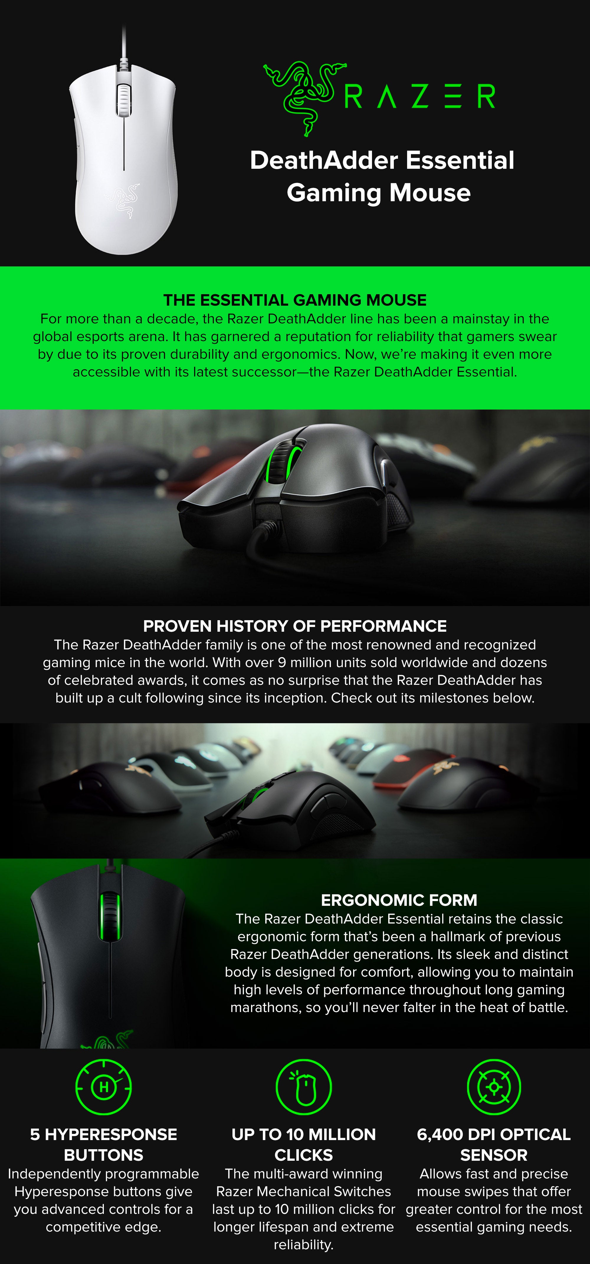 Razer DeathAdder Essential is the essential gaming mouse to kickstart a proper gaming rig. The 6,400 DPI optical sensor enables fast and precise swipes for great control, while an ergonomic form allows extended hours of gaming. It’s also built for durability, featuring 5 Hyperesponse buttons that can go up to 10 million clicks. Razer’s award-winning hardware includes high-performance gaming peripherals and Blade gaming laptops. Razer’s software platform, with over 175 million users, includes Razer Synapse (an Internet of Things platform), Razer Chroma RGB (a proprietary RGB lighting technology system supporting thousands of devices and hundreds of games/apps), and Razer Cortex (a game optimizer and launcher).