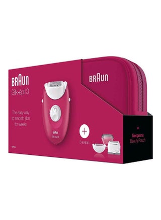 | محتويات العلبة | Braun Silk-épil 3 - 3-415 epilator Shaver Head with Trimmer cap Cleaning Brush Smart Plug Beauty Pouch |