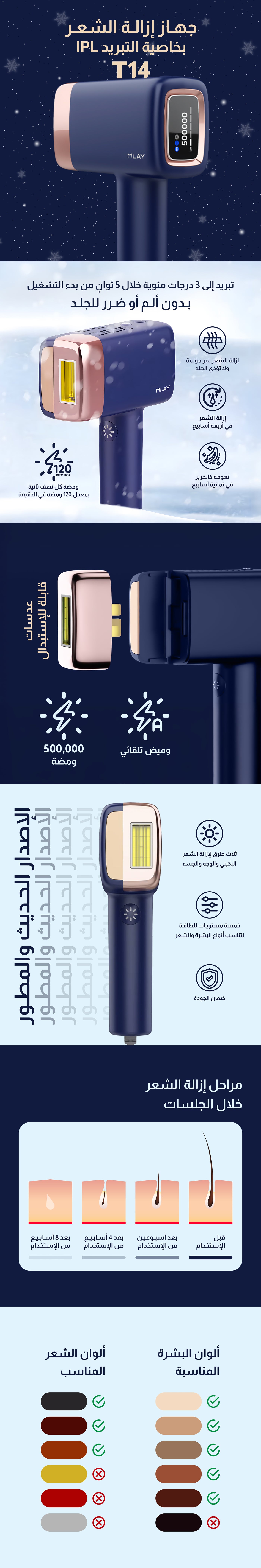 ليزر ملاي T14 الجديد بميزة التبريد، الإصدار الأحدث لإزالة الشعر من شركة ملاي.يتميز هذا الاصدار من ملاي بسرعة الومضات بحيث ان سرعه الومضة 0.5 ثانيه اي 120 ومضه في الدقيقة وبذلك اصبح هذا الجهاز اسرع اجهزة الليزر الى الان ويحقق نتائج وسريعة توازي أجهزة العيادات.