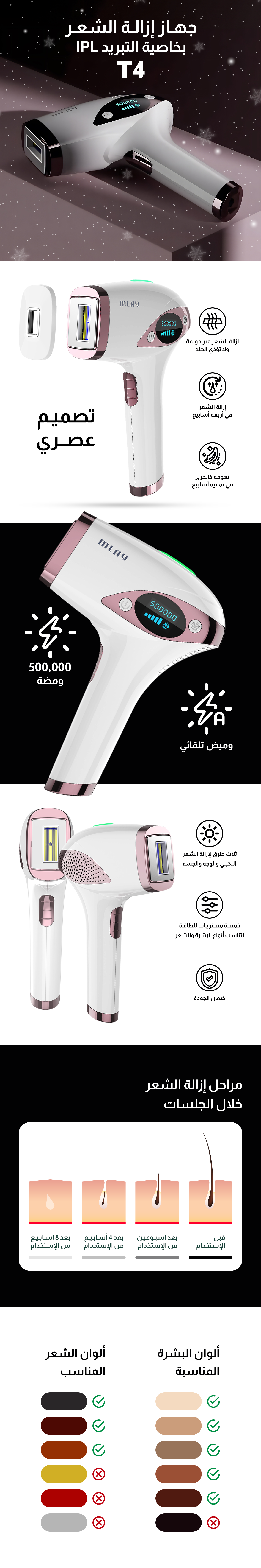 تقنية Iاي بي ال آمنة 100% على بشرتك: تضمن لك أحدث تقنيات إزالة الشعر بتقنية Iي بي ال السلامة الكاملة مقارنة بالطرق الأخرى لإزالة الشعر بشكل دائم. تتيح آلة إزالة الشعر بالليزر هذه المزودة بوظيفة تبريد الثلج استخدامها لإزالة الشعر دون إتلافه. ارتدي النظارات الواقية عند استخدام جهاز إزالة الشعر.