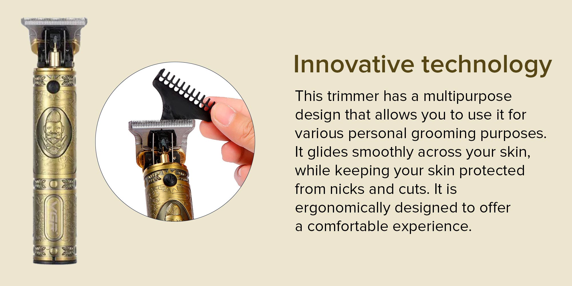 نبذة عن العلامة التجارية: تأسست VGR في عام 2015، وهي مؤسسة متكاملة ذات تقنية عالية تشمل البحث والتطوير والإنتاج والمبيعات والتجارة. وفي الوقت الحاضر، تتمثل منتجاتنا الرئيسية في ماكينات الحلاقة وقص الشعر ومجففات الشعر وأجهزة فرد الشعر ومزيلات الوبر. طريقة الاستخدام: 1. اختر حجم الواقي. 2. ججف قبل استخدام أداة التشذيب. 3. قم بتشغيل أداة التشذيب في الاتجاه المعاكس لنمو شعرك. 4. تجنب شد شعرك أو خدش بشرتك. 5. بعد الانتهاء من الحلاقة، يجب استخدام مرطب بعد الحلاقة.