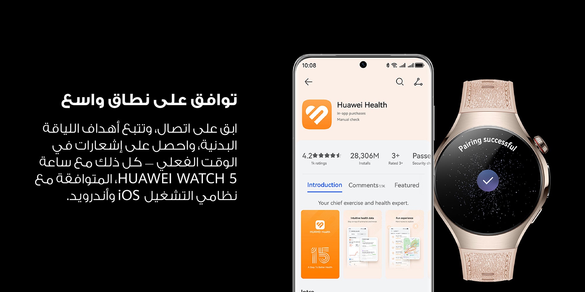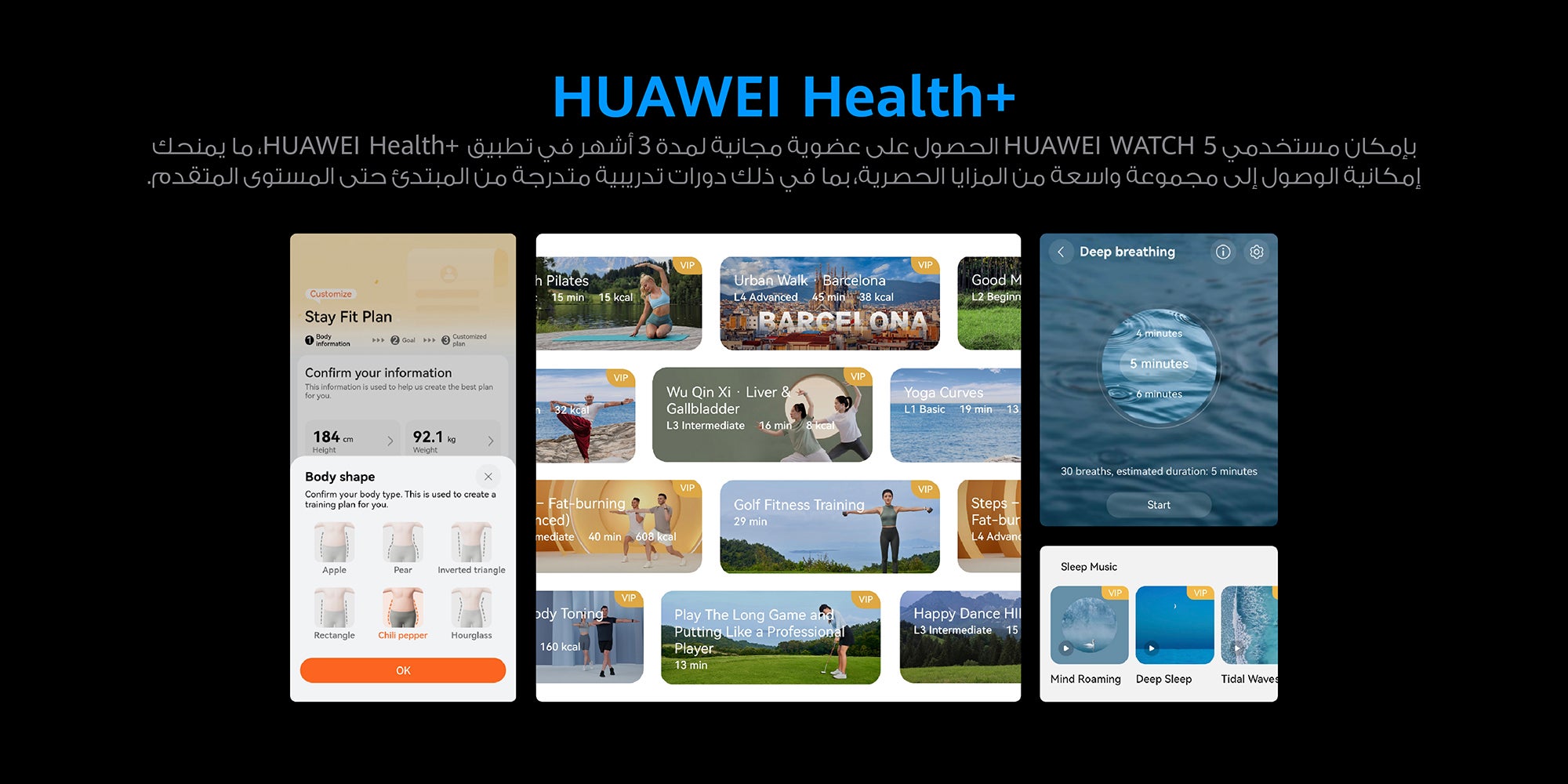 تتبنى سلسلة HUAWEI WATCH 5 تصميم الأزرار الفيزيائية، وتاج ساعة قابل للدوران، وشاشة ملونة. تأتي مع eSIM، مكالمات صوتية، مراقبة معدل ضربات القلب، تخطيط القلب الكهربائي، TruSleep™، قياس SpO2، دراسة صحة القلب، تحليل عدم انتظام ضربات القلب، الوعي بالتنفس أثناء النوم، مراقبة درجة حرارة الجلد، تقويم الدورة الشهرية، لمحة صحية، ملخص صحي، الرفاهية العاطفية، مراقبة الارتفاعات العالية، مراقبة التمارين، مساعد الرسائل، الربط الذكي، المساعد الصوتي، الدفع عبر الهاتف المحمول، GNSS، NFC، Wi-Fi، واجهات ساعة متنوعة، والشحن اللاسلكي، مما يجعلها مناسبة للاستخدام اليومي والتمارين الاحترافية.