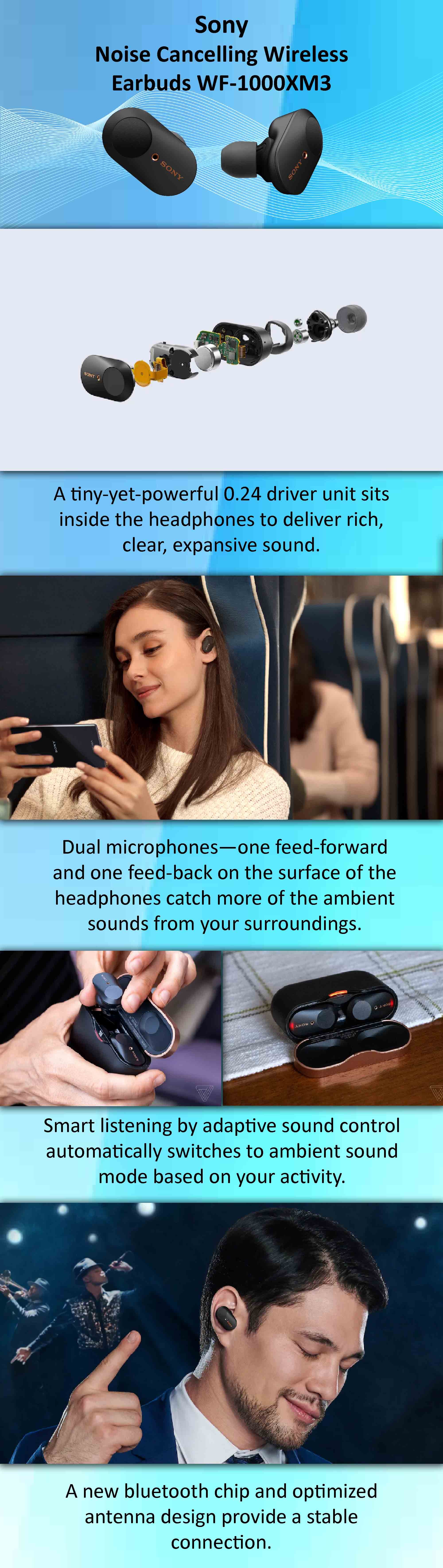 | محتويات العلبة | WF-1000XM3 Noise Cancelling Truly Wireless Headphones with Mic Black/Gold |