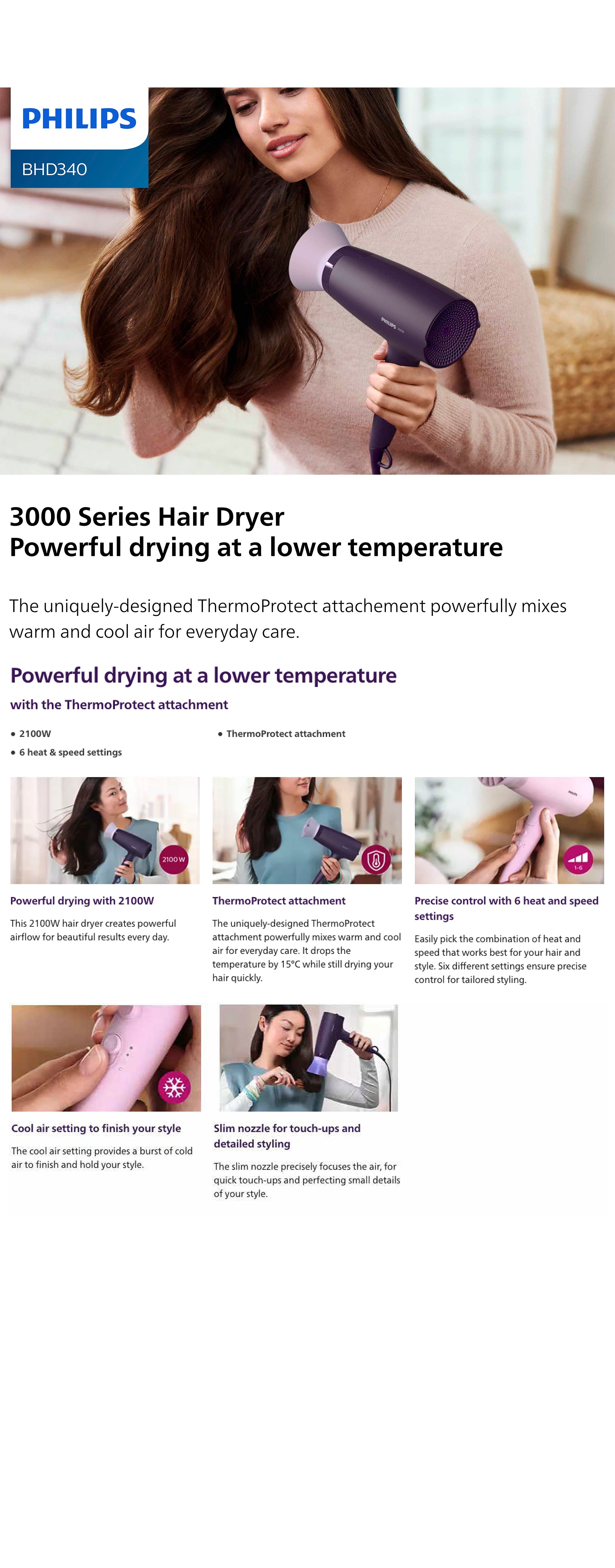 The uniquely-designed ThermoProtect attachment powerfully mixes warm and cool air for everyday care. It drops the temperature by 15°C while still drying your hair quickly.