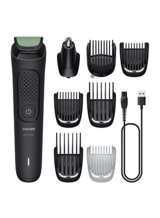 Philips All-in-One Trimmer 3000 Series (MG3940/15) – 8-in-1 Face & Hair Grooming Kit The Philips All-in-One Trimmer 3000 Series (MG3940/15) is a versatile 8-in-1 grooming kit designed to trim and style your face and hair effortlessly. It features self-sharpening tempered steel blades that remain sharp and rust-free for precise results without needing oil. With up to 70 minutes of run time and a dedicated body comb, this trimmer offers convenience and durability for your complete grooming routine. Key Features: • 8-in-1 Versatility: Includes 8 tools for trimming and styling your facial hair, clipping your hair, and grooming your body. • Self-Sharpening Steel Blades: Tempered steel blades won't break, dull, or rust, ensuring long-lasting precision and requiring no oil. • Skin-Friendly Performance: Reinforced guards and rounded blade tips provide a smooth, comfortable trim while preventing irritation. • Body Grooming: Comes with a click-on body comb for a gentle and effective trim on your body. • Nose & Ear Trimmer: Safely and gently removes unwanted nose and ear hair without nicks or cuts. • 70 Minutes Run Time: Rechargeable Ni-MH battery provides up to 70 minutes of cordless use after an 8-hour charge. • Easy Maintenance: Rinseable attachments make cleaning simple—just detach and rinse under the tap. • Durable Design: Built to last with an ergonomic grip for easy handling and control. • Battery Indicator: Lights indicate when the battery is low, charging, or empty. Box Contains: • 1 x Trimmer Handle • 1 x Nose & Ear Trimmer Head • 1 x Adjustable Beard Comb (3-7mm) • 2 x Stubble Combs (1mm, 2mm) • 3 x Hair Combs (9mm, 12mm, 16mm) • 1 x Cleaning Brush • 1 x USB-A Charging Cable (Adapter Not Included) • 1 x Soft Pouch