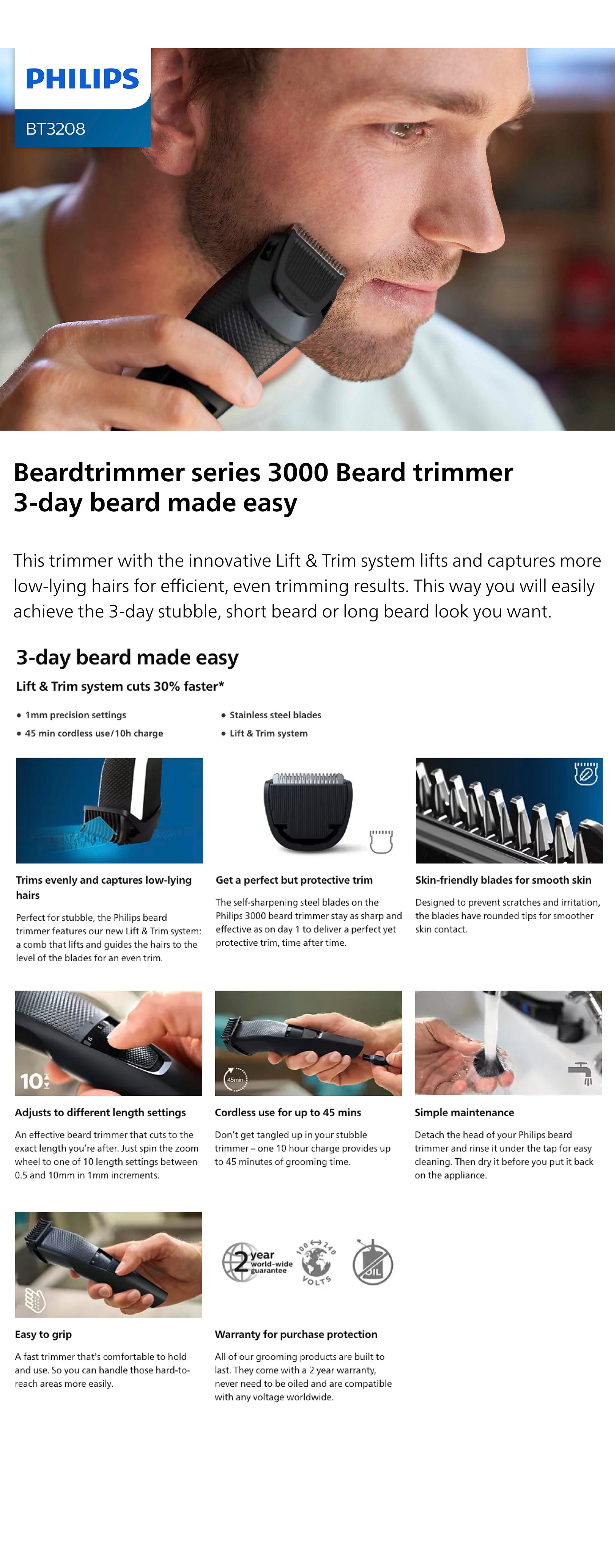 Philips Beardtrimmer series 3000 BT3208/13, is a trimmer with the innovative Lift & Trim system lifts and captures more low-lying hairs for efficient, even trimming results. This way you will easily achieve the 3-day stubble, short beard or long beard look you want.