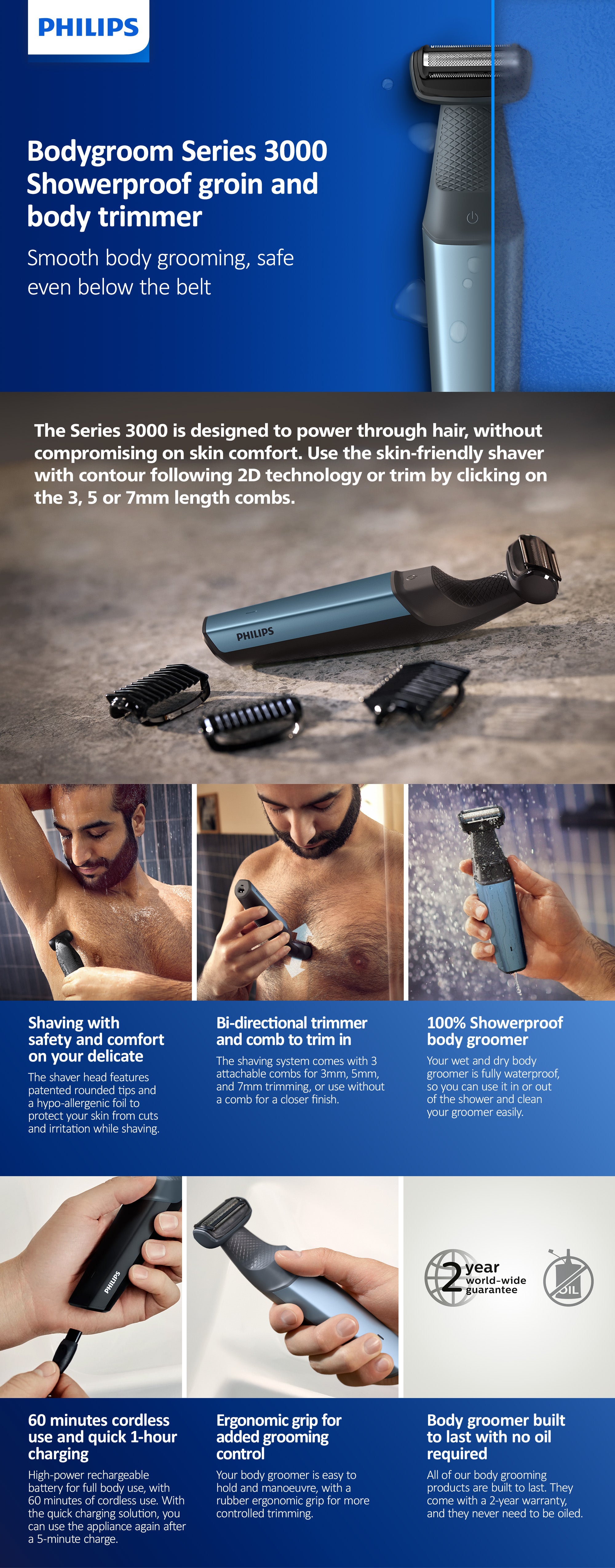 Your body groomer is easy to hold and manoeuvre, with a rubber ergonomic grip for more controlled trimming