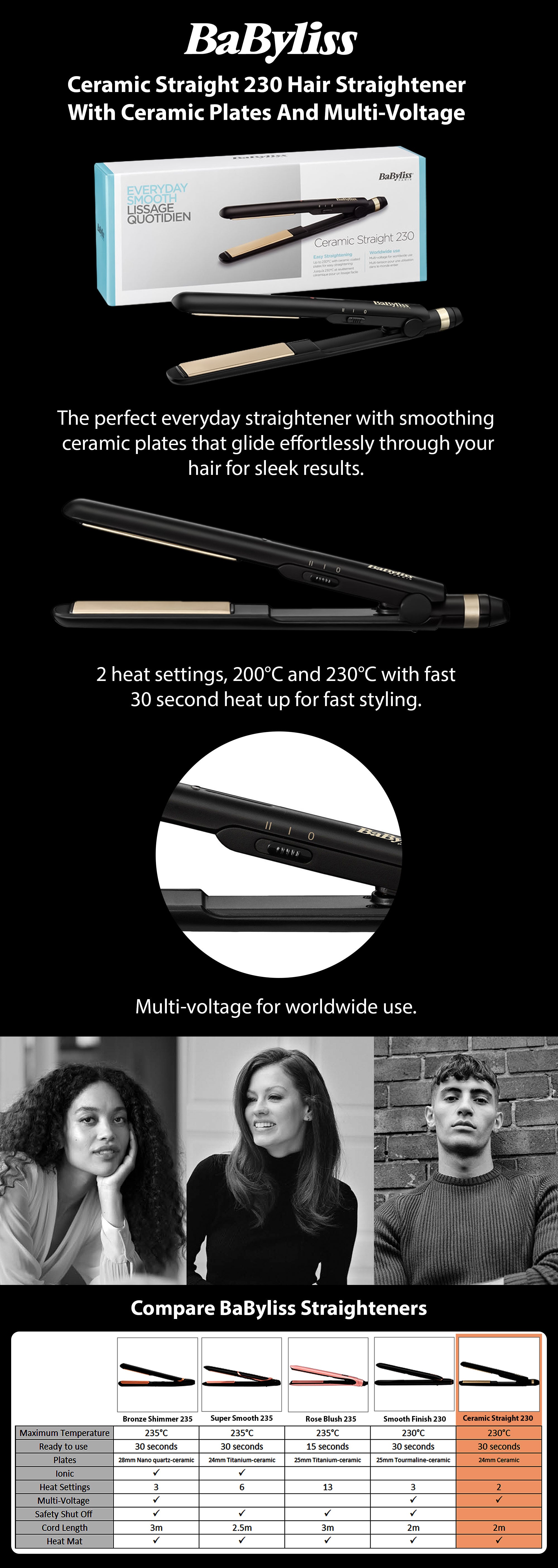 The slim ceramic plates flow during the hair, for a smooth, shiny finish, BaByliss Ceramic 230 straightener reaches as much as 230°C for high heat performance and is able to use in just 30 seconds. It has variable heat settings, suitable for different hair types to provide total keep an eye on. For thicker hair, use the upper heat settings. Delivers as much as 230 degrees C salon temperature for an instant frizz-free salon straight style. Ceramic plates flow during the hair without an equal high shine glossy finish. Easy to make use of with two temperature settings for total keep an eye on even as styling.
