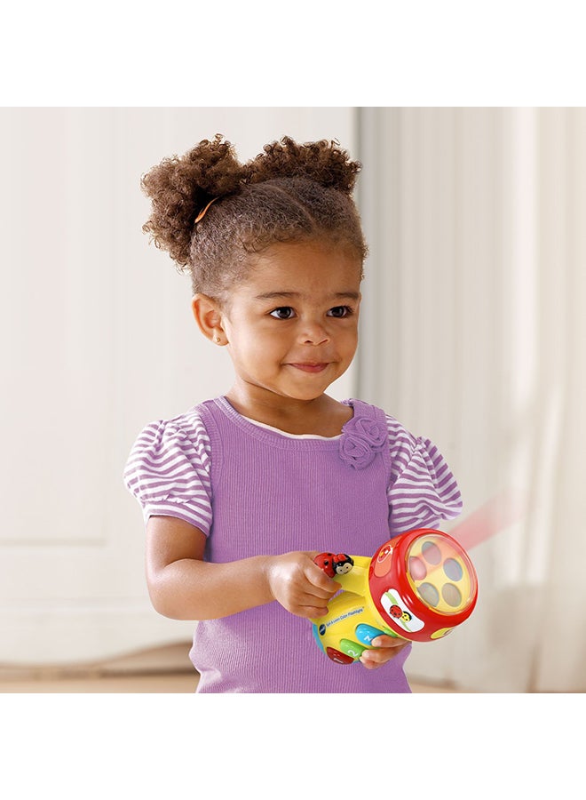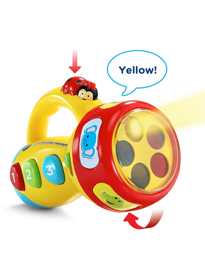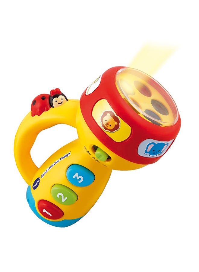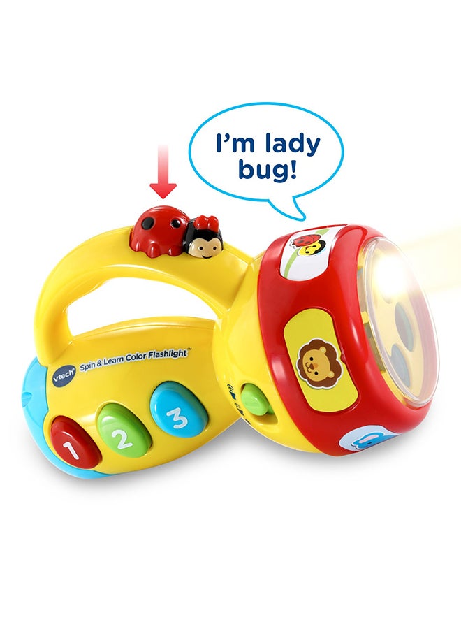 The Spin & Learn Color Flashlight will light up your child's life! With its engaging ladybug button that speaks to your child and three colorful buttons, your child will learn all about numbers as they hear fun songs. The flashlight glows with a rainbow of colors and can be changed by spinning the ring that also teaches your child about colors and animals. With its easy-to-grip handle, your toddler will want to take this learning toy flashlight with them on every adventure! Intended for ages 12-36 months. Requires 2 AAA batteries. Batteries included for demo purposes only. New batteries recommended for regular use.