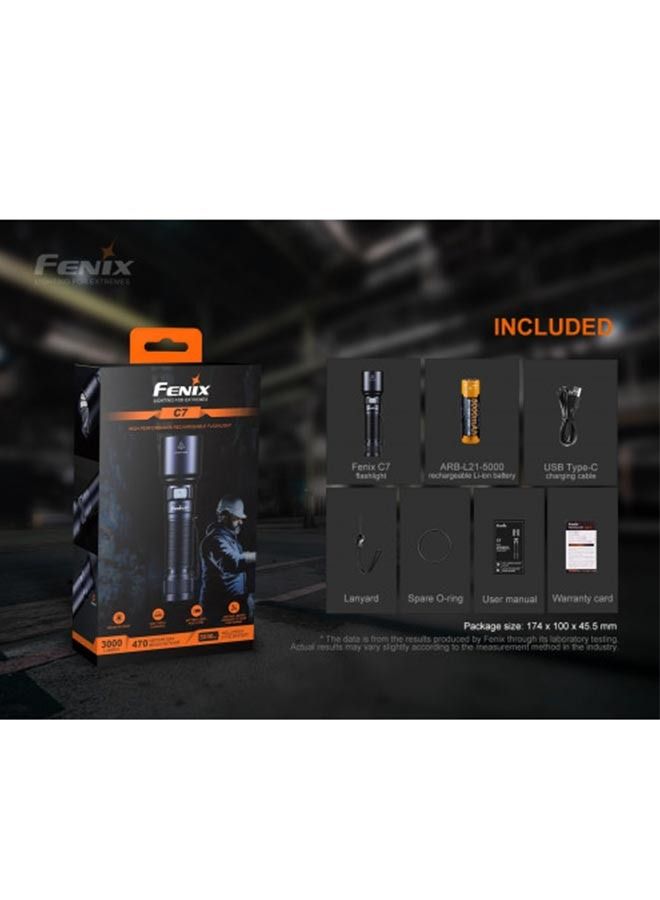 The Fenix C7 Flashlight is a high-performance flashlight that is the perfect tool for industrial and maintenance operations. Delivering up to 3000 lumens, the Fenix C7 flashlight can throw that light a maximum distance of 1542ft (470m). Always know the battery’s status with the battery level indicator and keep the included 5000mAh battery charged via the USB Type-C port. The magnetic base on the Fenix C7 allows you to attach the flashlight to most metal surfaces for hands-free lighting. Waterproof, dustproof and impact resistant to 1m, the C7 Flashlight is built tough enough to withstand anything your job site can dish out. *Does not have a tail switch. C7 SIZE Length: 5.87” (149mm) Head: 1.57” (40mm) Body: 1.06” (27mm) C7 WEIGHT 6.07 oz. (172g) excluding battery C7 BATTERY TYPE One included 21700 rechargeable li-ion battery INCLUDED ARB-L21-5000 rechargeable li-ion battery, USB Type-C charging cable, lanyard, spare O-ring WARRANTY Limited Lifetime Guarantee from Fenix Lighting USA
