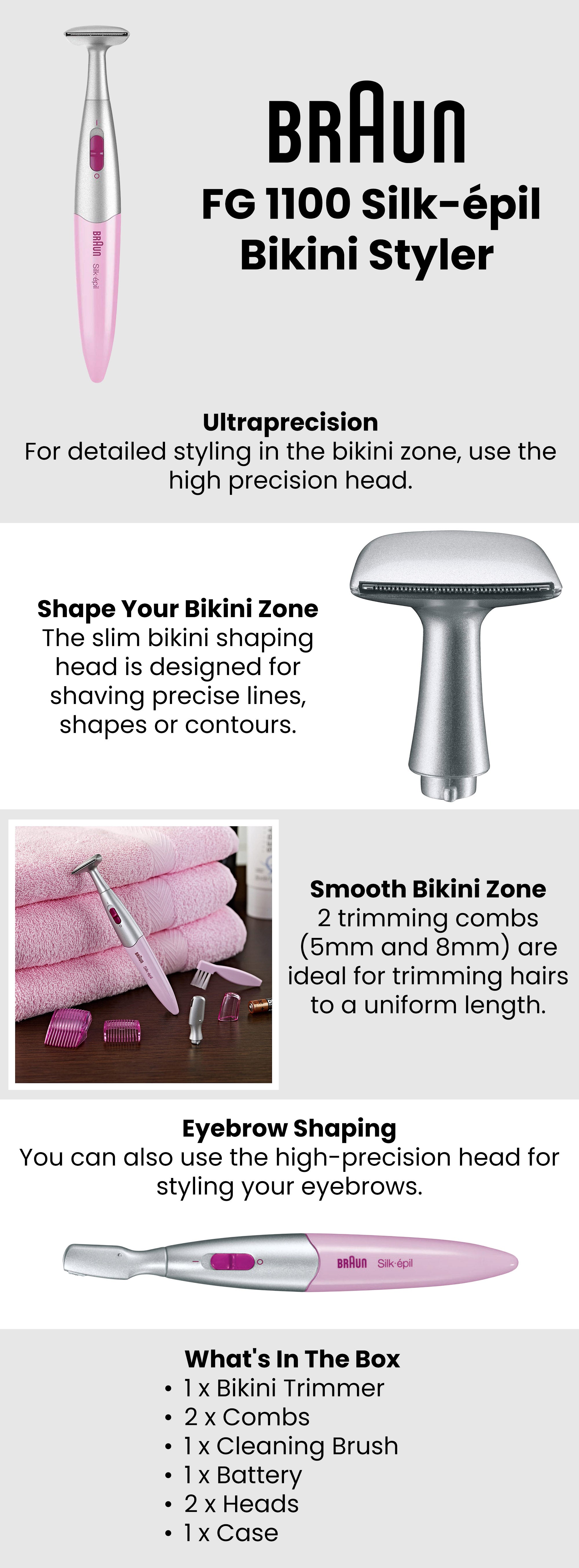 About the product: Reveal your creativity with Braun Bikini Trimmer FG1100 - precision trimming at your fingertips. No matter what personality you have, shaping your bikini zone can enhance your beauty and give you an extra boost of confidence. It may even bring out your wild side. Braun Bikini Trimmer has a precision head, allowing you to achieve accurate shapes, fast and easy. Whats more, it removes and trims any unwanted hair from the eyebrows, bikini line and face. So now you can get creative, even in the most sensitive areas – without irritation. The possibilities are only limited by your imagination.