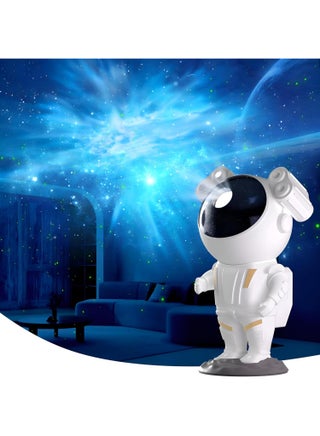 Transform your room into a starry sky with this astronaut-shaped galaxy projector. It projects a light nebula with laser stars, and the head can be turned to adjust the projection angle. With the remote, you can change patterns, set a timer, and control the brightness and speed of the nebula. It's ideal as a nightlight for children, or for creating a special atmosphere in bedrooms, home theaters, and gaming rooms. USB-powered and portable.