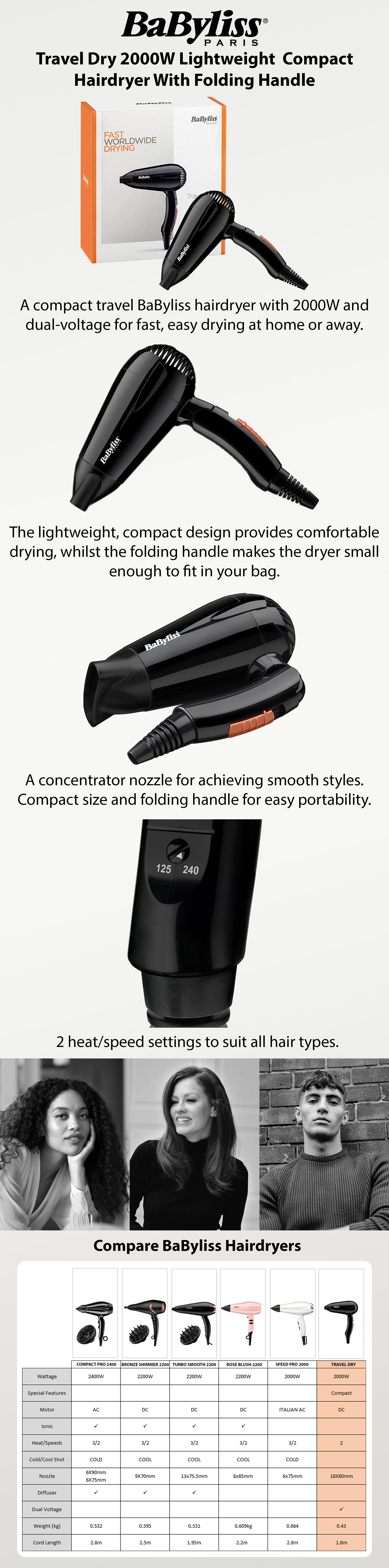 The BaByliss 5344SDE Hair Dryer is engineered for exceptional performance and travel convenience. Boasting a potent 2000W motor, it delivers swift drying, offering salon-quality results effortlessly. With dual voltage support, globetrotters can style anywhere without any worries. Customize your experience with 2 heat/speed settings for diverse hair types. Its advanced tech ensures rapid drying while the lightweight, portable design makes it your perfect travel companion for flawless styling on the go.