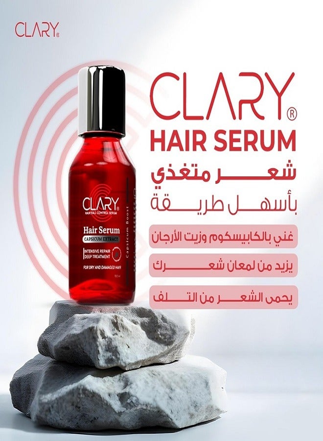 Stimulates the hair follicles to speed up growth, and repairs dry hair. It also provides deep smoothing and anti-frizz effect, targets split ends and instantly transforms the hair texture. Capsicums extract is one of the best hair growth boosting products that improves the blood circulation to the scalp, which results in strengthening hair follicles and stimulating hair growth and Repairs dry hair and controls its frizz for Dry and Frizzy Hair. Wash your hair with CLARY Shampoo Apply 1:2 drops of CLARY Hair Serum on damp hair starting from mid hair towards tips