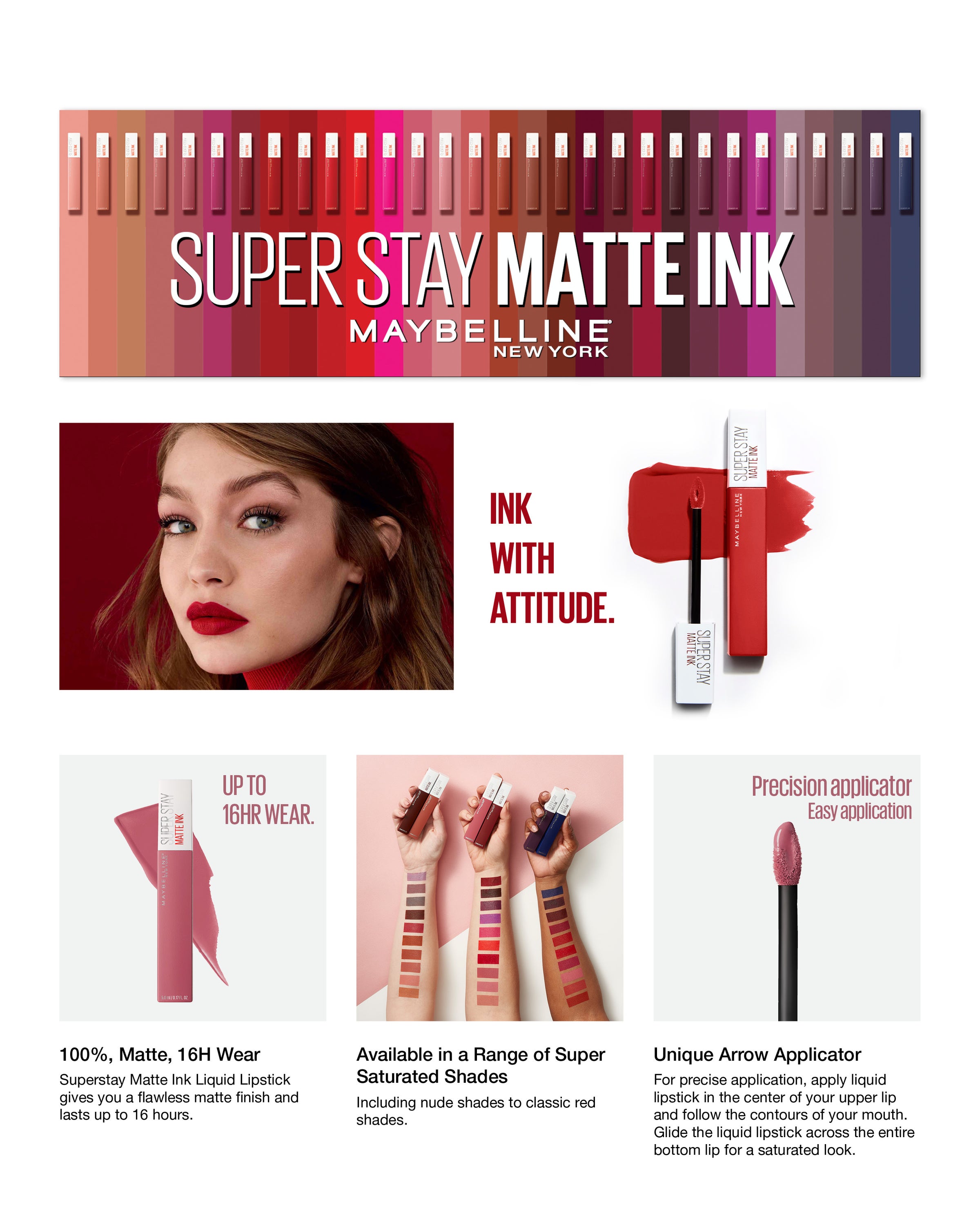 Intensely perfect, perfectly intense. Ink your lips in up to 16 hours of saturated matte with Maybelline New York’s Super Stay Matte Ink™ Liquid Lipstick! This highly pigmented liquid matte lipstick features a unique arrow applicator for precise application