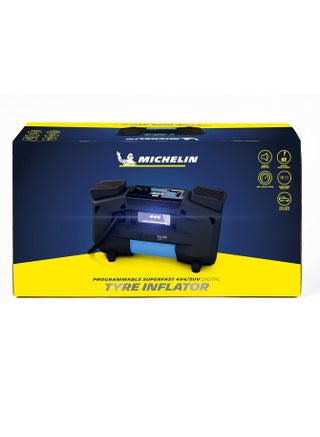 The Michelin 12314 Digital High-Speed Tire Inflator is the perfect solution for anyone seeking reliable and efficient tire inflation, especially for 4×4 and SUV vehicles. With its robust design and a variety of features, this inflator is an essential tool for every driver. Features: High Speed: The inflator provides rapid tire inflation, allowing you to restore tire pressure in minimal time—ideal for long trips or urgent needs. Digital Display: Equipped with a digital screen that accurately displays tire pressure, making it easy to monitor pressure levels while inflating. Preset Settings: Includes preset options for optimal tire pressure, simplifying the inflation process and enhancing safety. Deflation Valve: Features a built-in deflation valve, allowing you to easily release excess pressure when necessary, ensuring tire safety. 3-Piece Adapters: Comes with three different adapters, making it compatible with a variety of vehicles, including cars, trucks, and bikes. LED Light: Includes an integrated LED light, making it convenient to use in low-light conditions or at night, adding extra comfort during use. How to Use: Connect the inflator to the vehicle's power source. Select the appropriate adapter for the tire you want to inflate. Attach the inflator to the tire valve and set the desired pressure using the preset options. Press the power button to start inflation, monitoring the digital display until the desired pressure is reached.