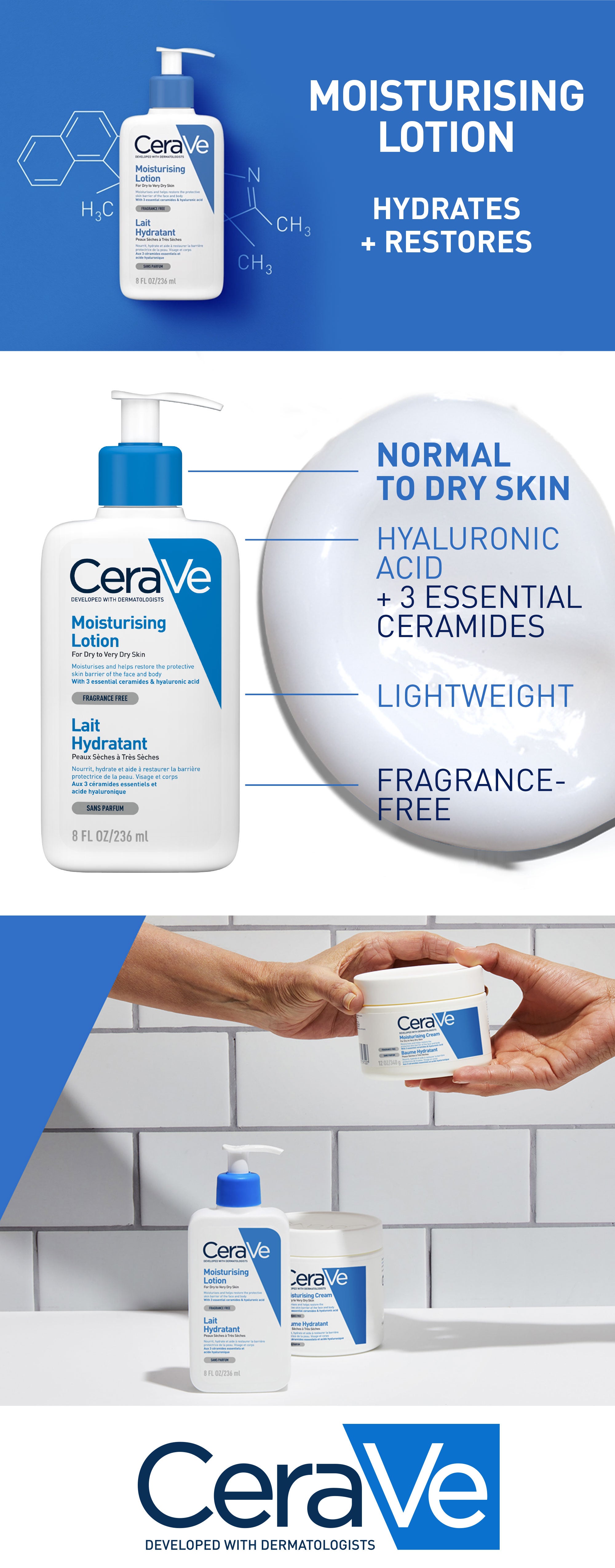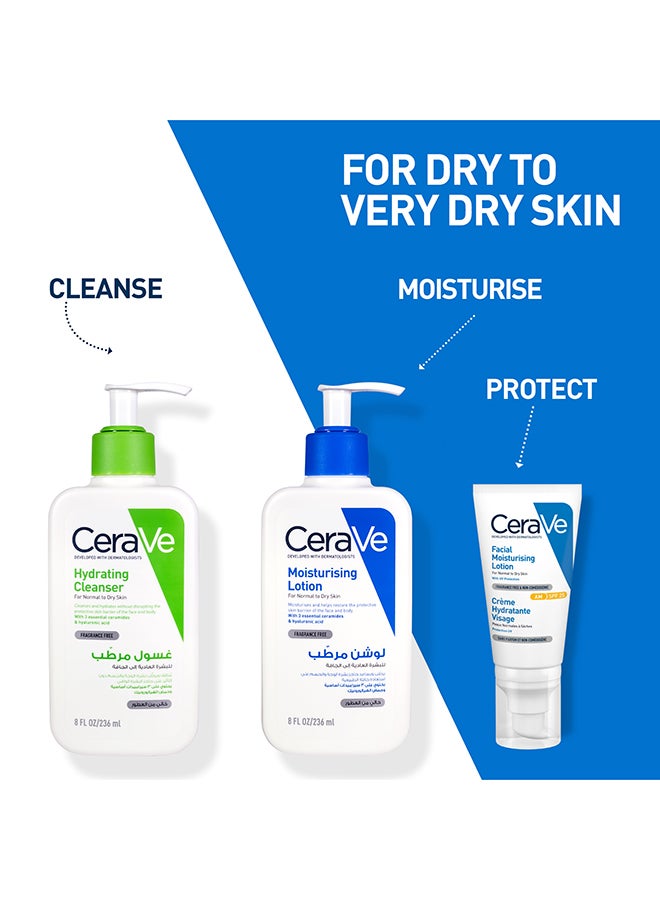 CeraVe Daily Moisturizing Lotion is a lightweight, oil-free moisturizer that helps hydrate the skin and restore its natural barrier. Formulated with three essential ceramides and hyaluronic acid, it also features patented MVE Technology for long-lasting hydration and a lightweight, non-comedogenic formula that won’t clog pores. Our daily moisturizer leaves the skin feeling comfortable and is gentle on the skin as it provides 24-hour hydration.