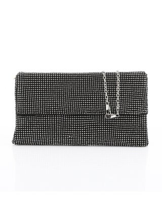 Elevate your evening look with this Black crystal-embellished clutch bag, designed for women who appreciate glamour and elegance. Crafted from high-quality fabric and fully adorned with shimmering rhinestones, this clutch offers a dazzling finish perfect for parties, weddings, and formal occasions.Its compact size allows you to carry essentials such as a phone, cards, keys, and makeup. The fold-over flap closure ensures secure storage, while the detachable Silver chain strap provides versatile carrying options—wear it as a crossbody, shoulder bag, or hand-held clutch. Lightweight yet durable, this evening clutch adds a statement sparkle to any outfit.