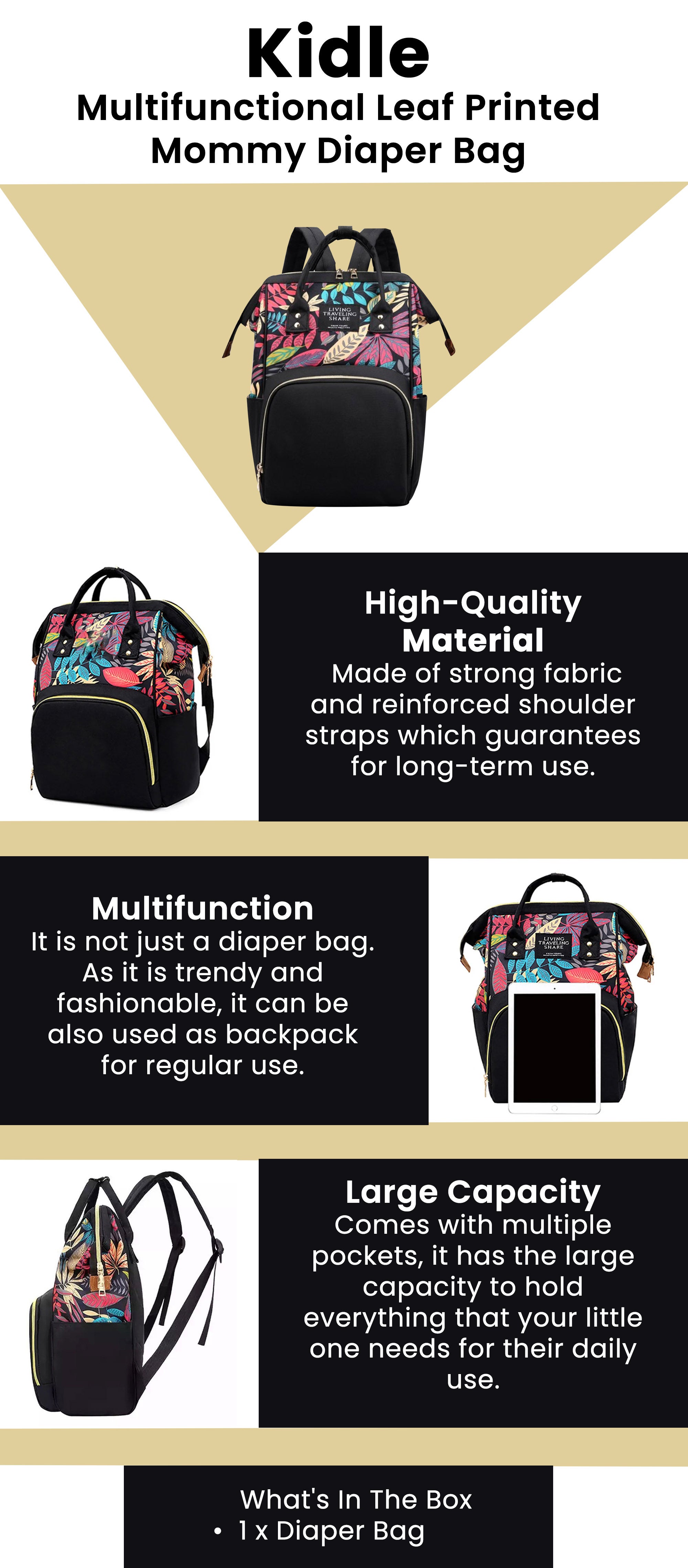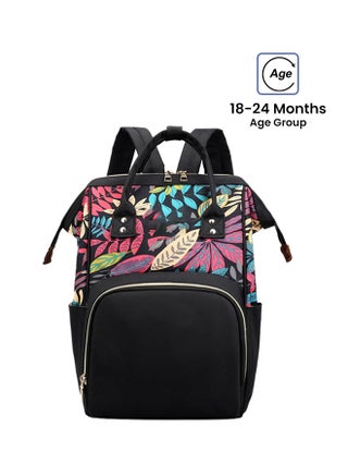 Multifunctional Large Capacity Leaf Printed Mommy Diaper Bag, 18-24 Months - Black