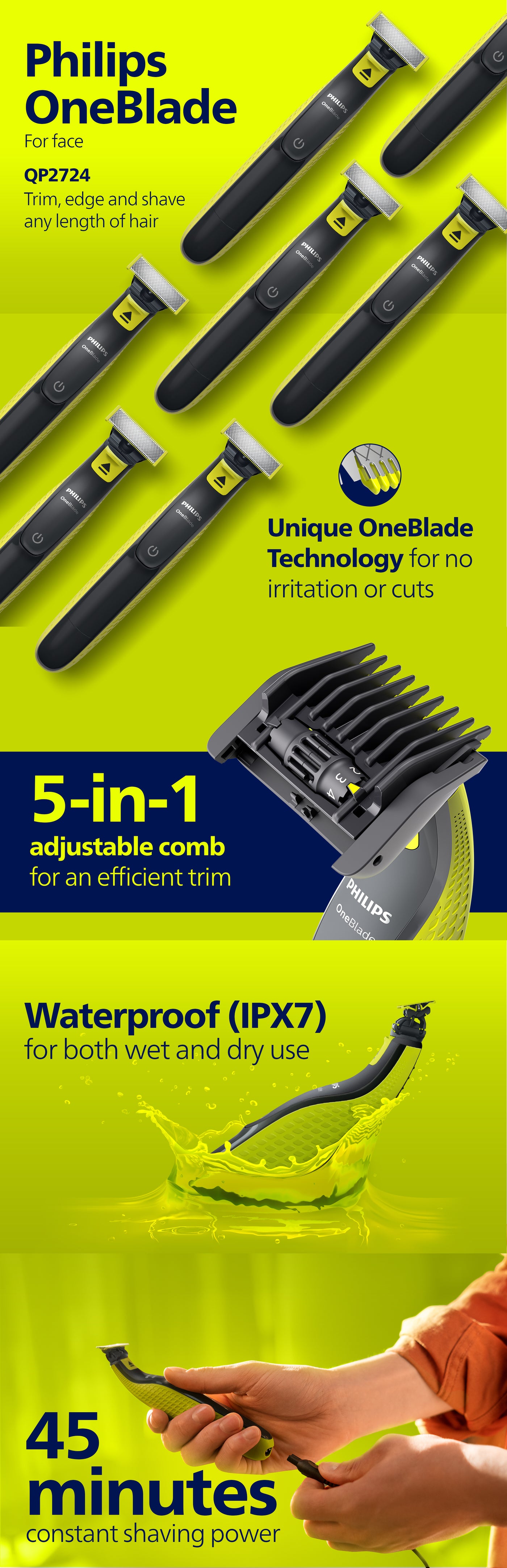 OneBlade QP2724/20,Trim, Edge & Shave Any Length of Hair| 5-in-1 Adjustable Comb, Dual-Sided Blade,45min Cordless Use, USB Charging QP2724/20/Lime Green