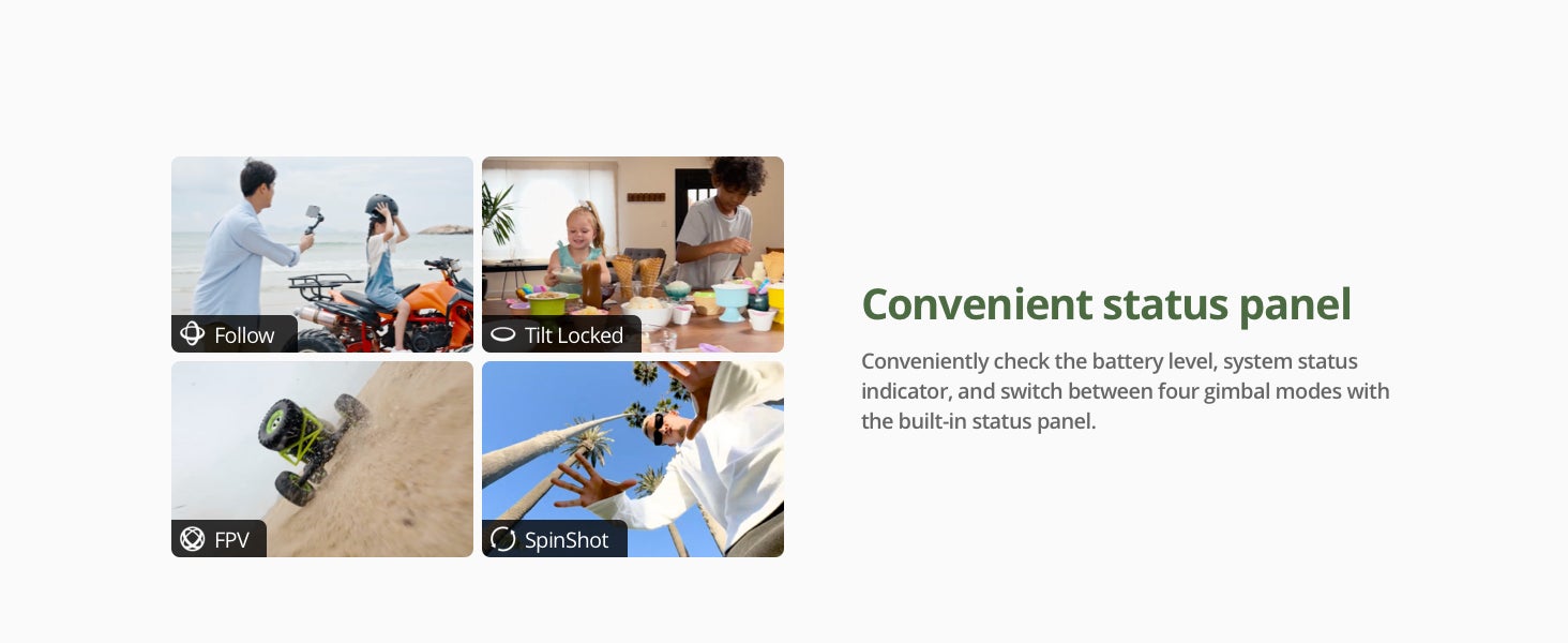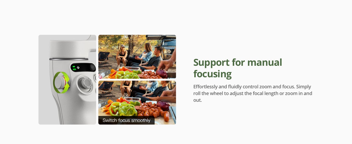 Simple Guides and One-Tap Editing - This DJI gimbal is intelligent with wide-ranging shooting guides that are easy to master. Use LightCut [3] and edit easily from wherever you are..Intuitive Control - A new side wheel adjusts focus and zoom. Get cinematic blurs or zoom smoothly in and out for dramatic effect. Elegant Slate Gray - It is stain resistant and coated in a non-slip texture, with an ergonomic grip that will keep it secure in your hands