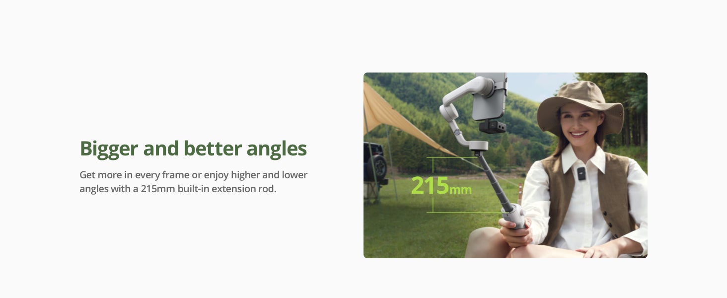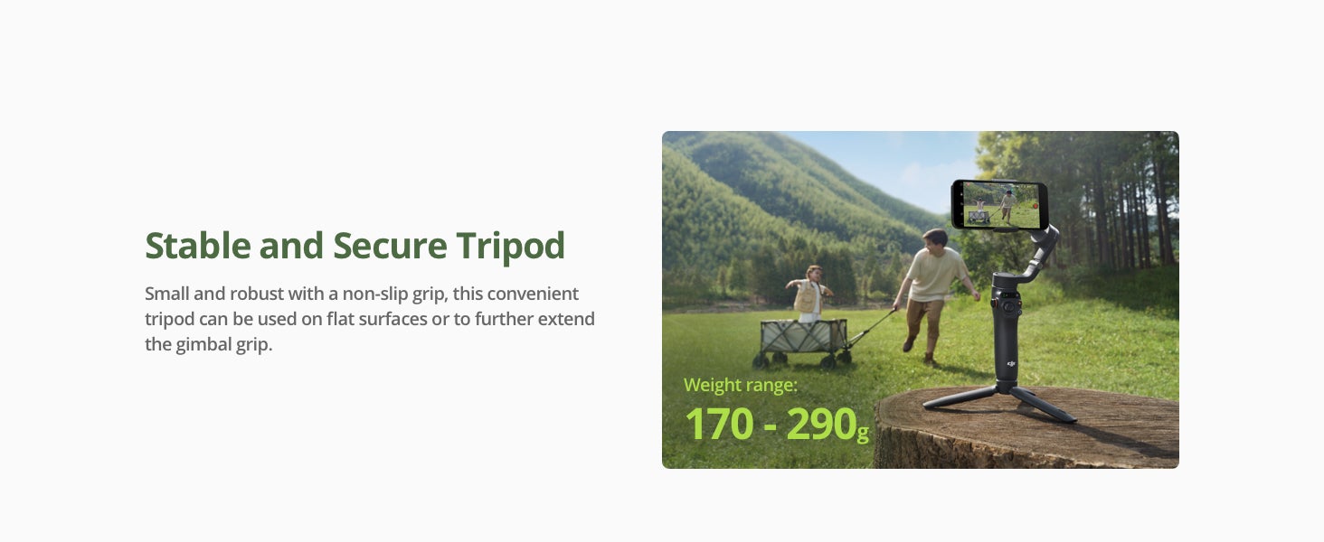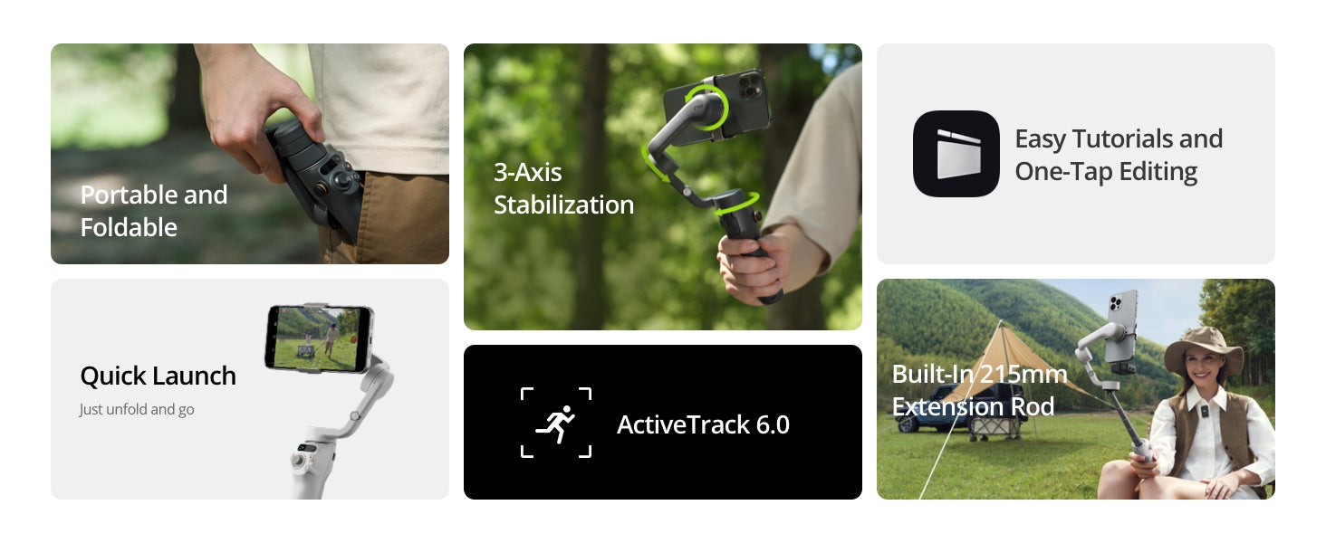 3-Axis Stabilization - Get stable footage with your cellphone gimbal stabilizer. DJI’s integrated advanced stabilization technology compensates for unwanted movements and catches the moment with cinematic smoothness