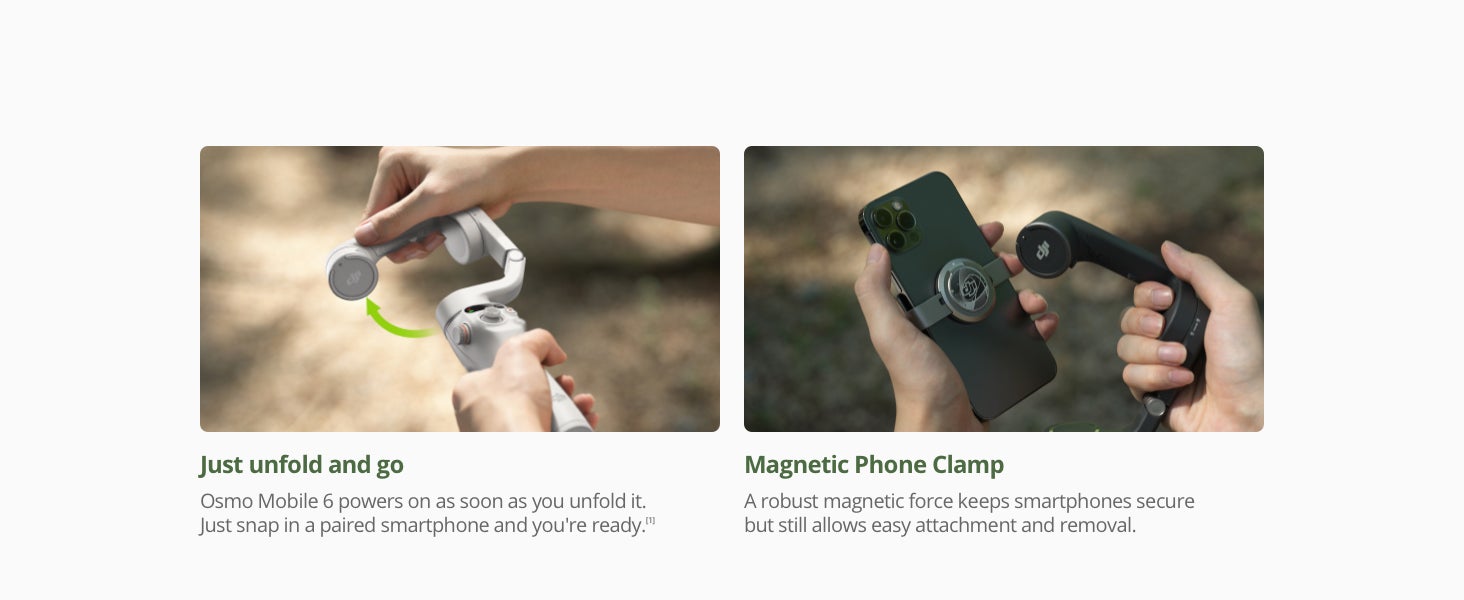 Quick Launch - Unfold and magnetically snap-in. The DJI Mimo app pops up as soon as you snap your smartphone to the gimbal. [1] Tap to open, and you’ll be ready to shoot