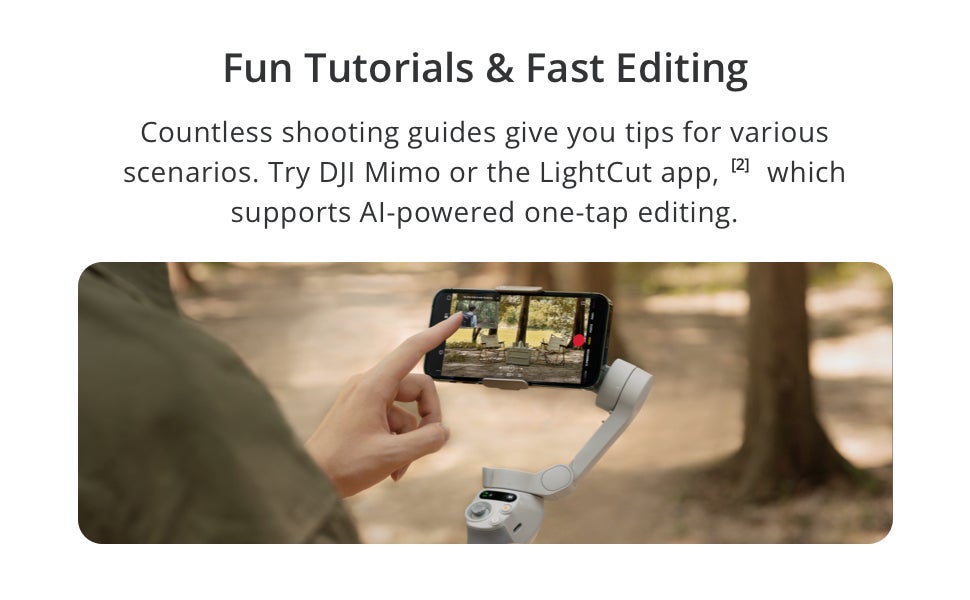 Effortless Editing - Whether it's shot-by-shot assistance with DJI Mimo's ShotGuides or the mulude of templates to choose from in LightCut, go beyond just cutting down clips and get edits that inspire