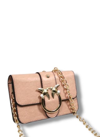 شنطة بتصميم أنيق وتفاصيل راقية، تتميز بواجهة أمامية مزينة بإكسسوار معدني ذهبي على هيئة طائرين يحملان حلقة دائرية، مما يمنحها طابعًا فخمًا ولمسة أنثوية مميزة. تم تنفيذ الخياطة بدقة عالية على الحواف، ويأتي الغطاء الأمامي مزودًا بزر معدني للإغلاق، يوفّر مستوى جيدًا من الأمان وسهولة الاستخدام.