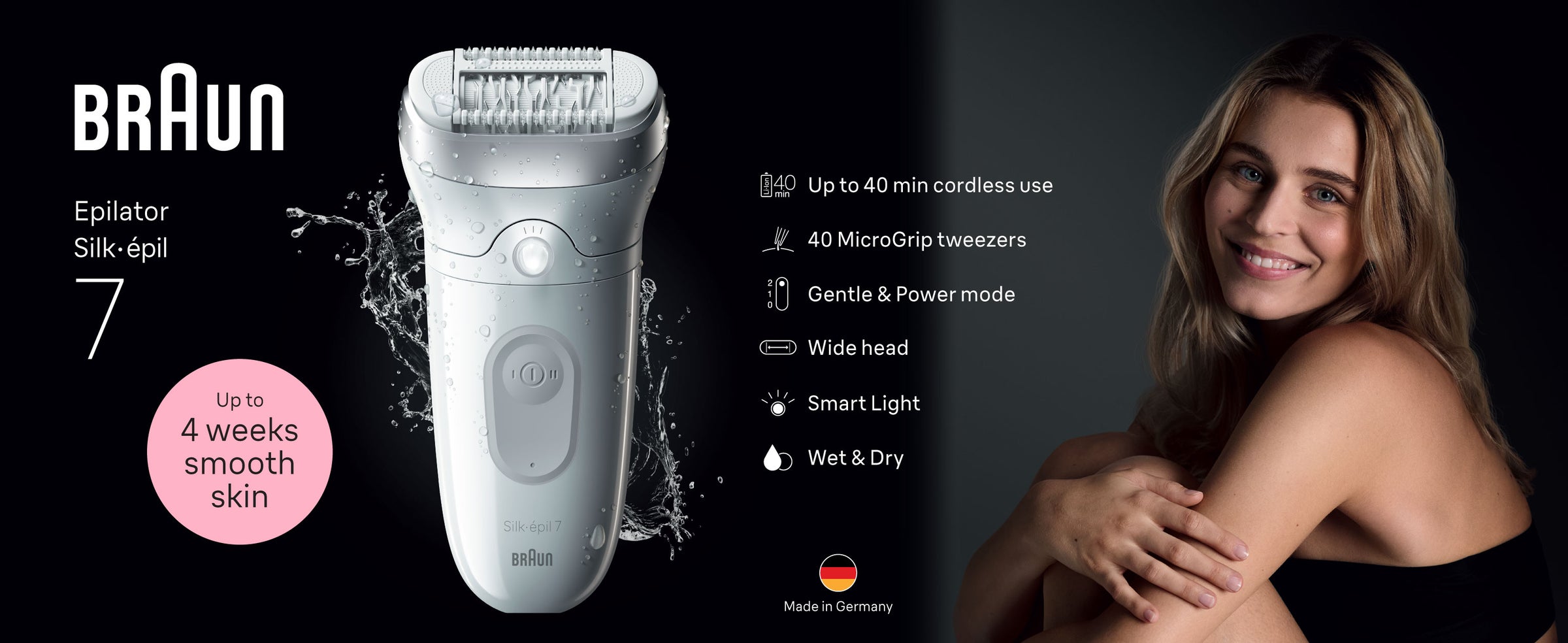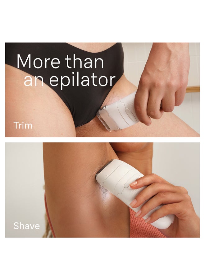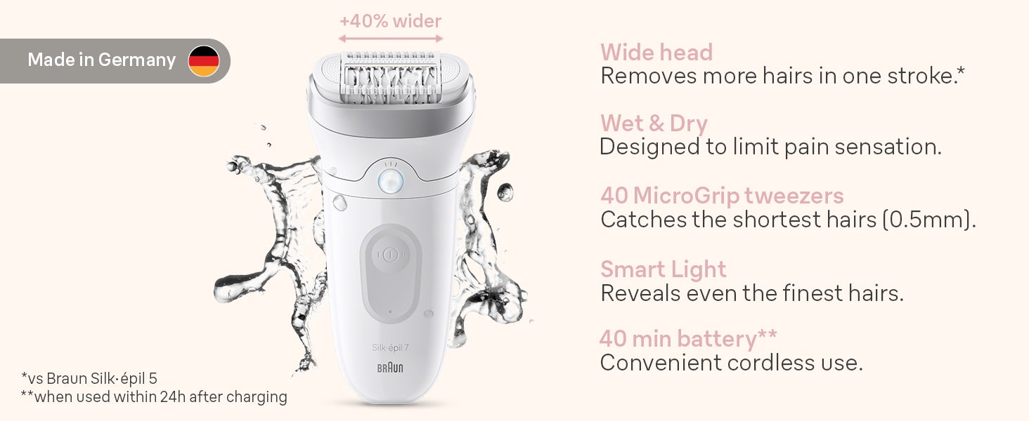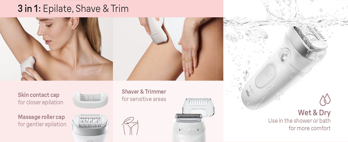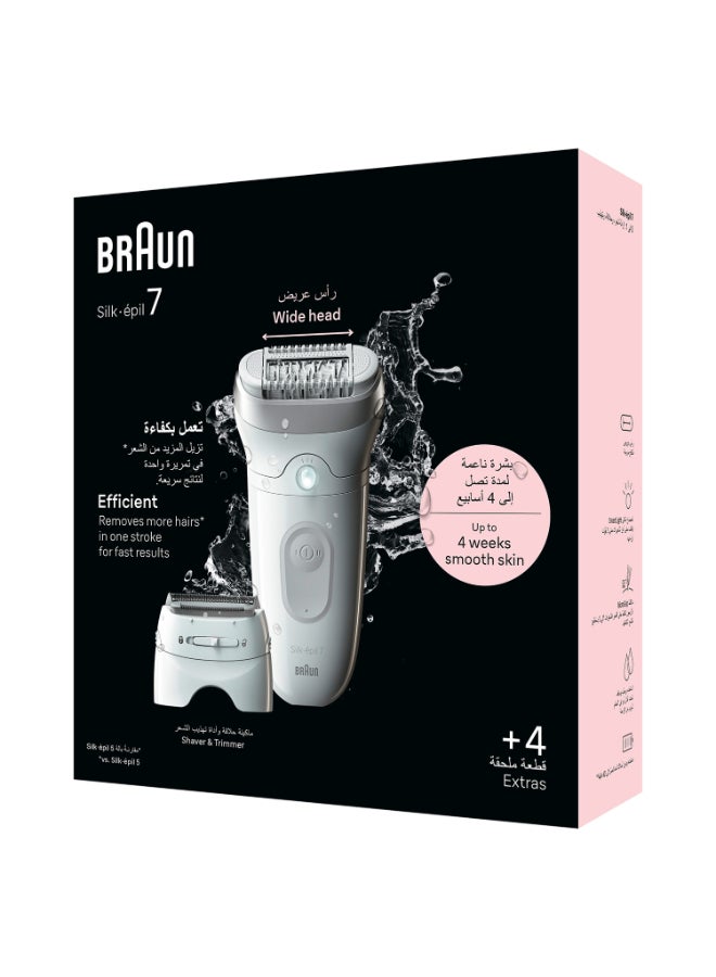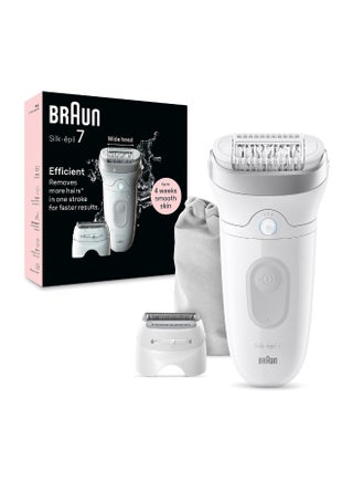 The Braun Silk-Epil 7 3-in-1 Epilator and Trimmer is your ultimate solution for smooth, long-lasting skin. With its wide head and 40 micro-grip tweezers, it removes more hair in a single stroke, even as short as 0.5mm. The Smart Light ensures no hair goes unnoticed, providing a thorough hair removal experience. Designed for both wet and dry use, this versatile device is perfect for use in the shower or bath, adding extra comfort to your grooming routine. With a 40-minute cordless run time, the Silk-Epil 7 also includes a trimming attachment for precise detailing, making it a complete hair removal and trimming tool.